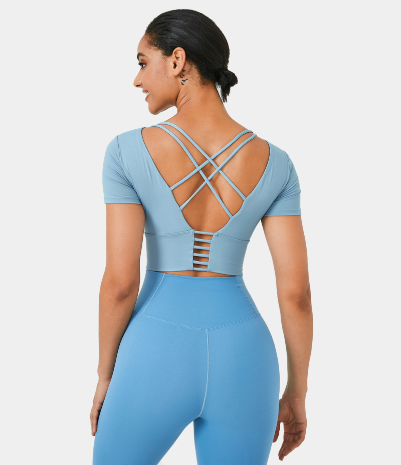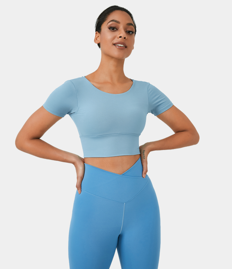 :: Halara Round Neck Short Sleeve Crisscross Cropped Sports Women's Tops Glacier Blue | MSGLYHV-81