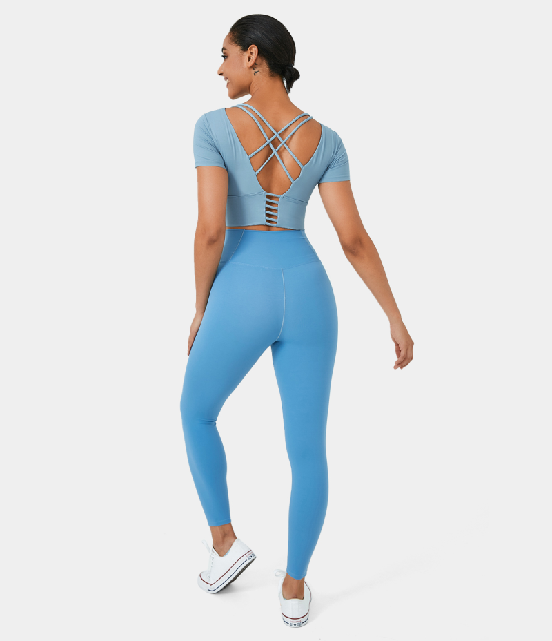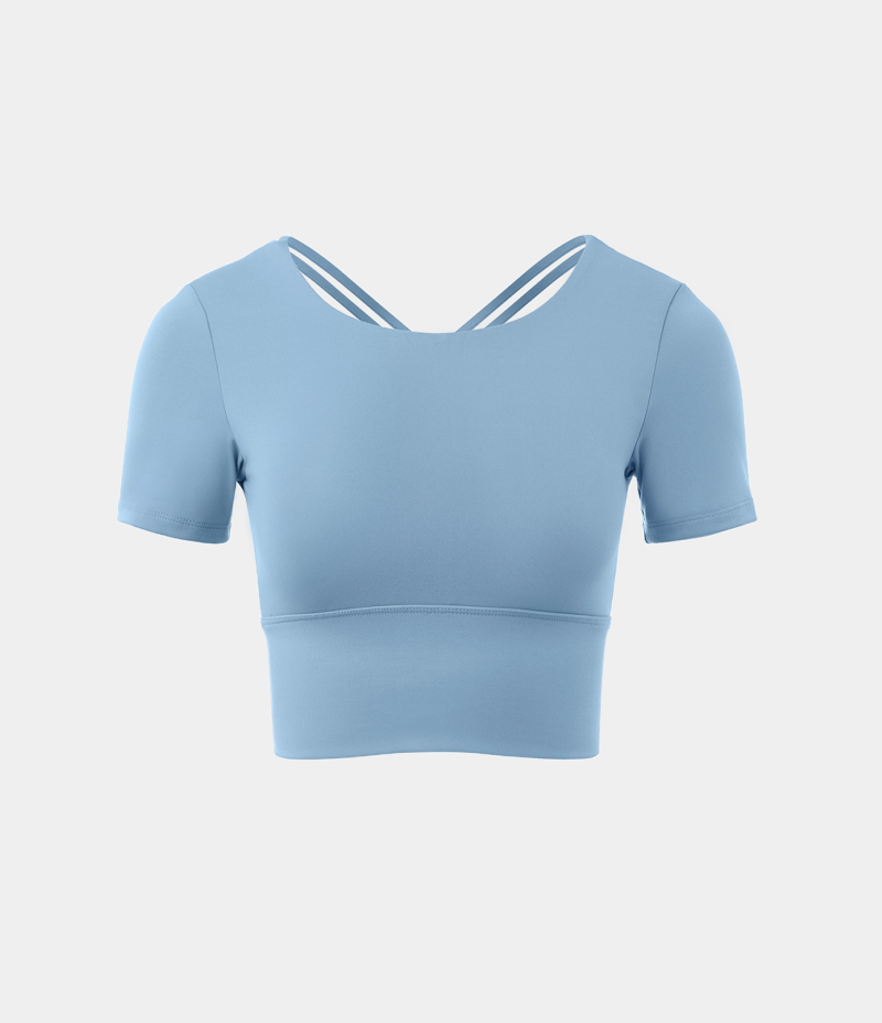 :: Halara Round Neck Short Sleeve Crisscross Cropped Sports Women's Tops Glacier Blue | TQSCAUB-71