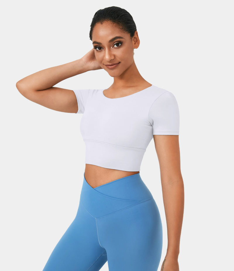 :: Halara Round Neck Short Sleeve Crisscross Cropped Sports Women's Tops White | OGICNSH-46