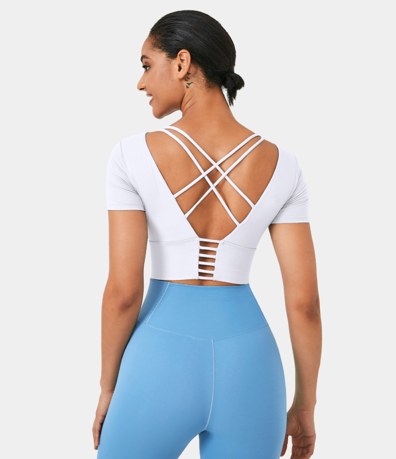 :: Halara Round Neck Short Sleeve Crisscross Cropped Sports Women's Tops White | ZHDCGXE-83