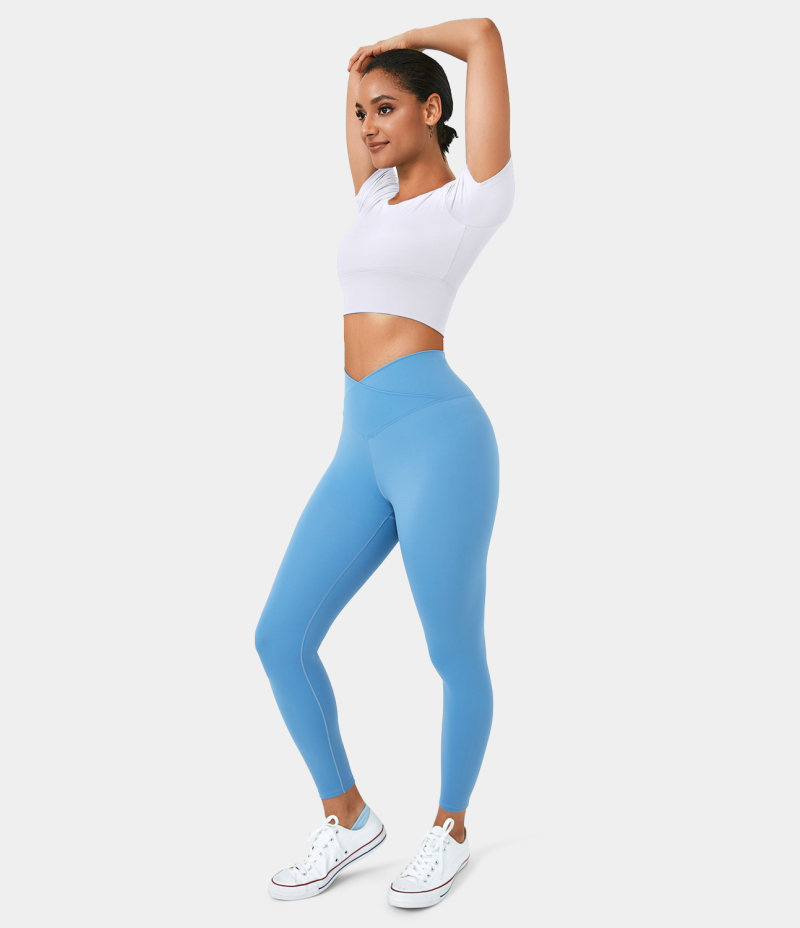 Halara Round Neck Short Sleeve Crisscross Cropped Sports Women's Tops White | ZHDCGXE-83