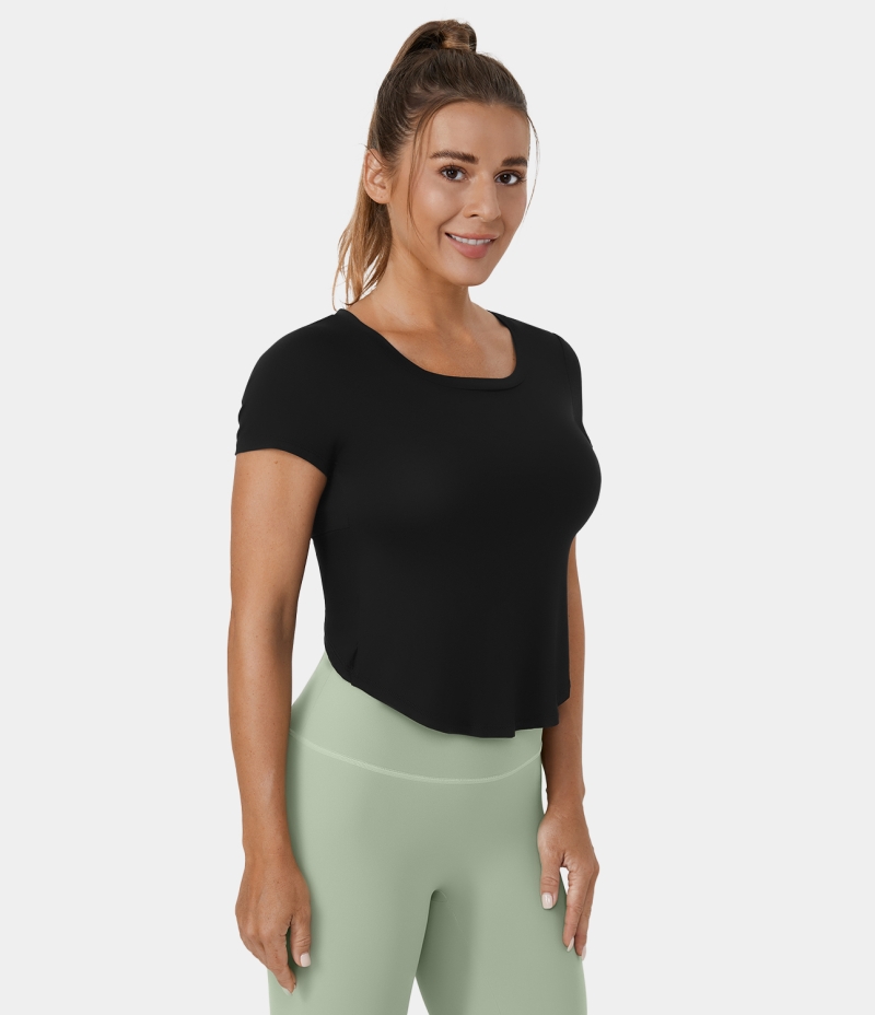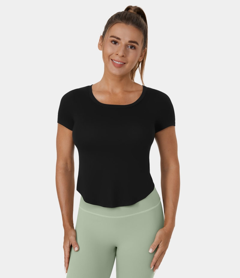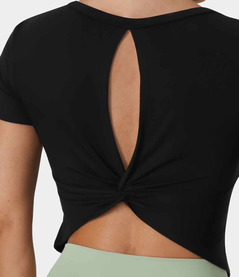 :: Halara Round Neck Short Sleeve Twisted Cut Out Cropped Barre Ballet Dance Sports Women's Tops Black | GXEMYHO-52