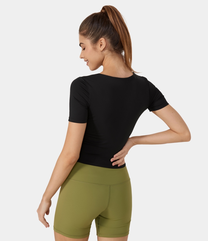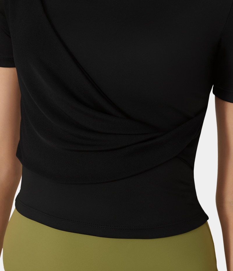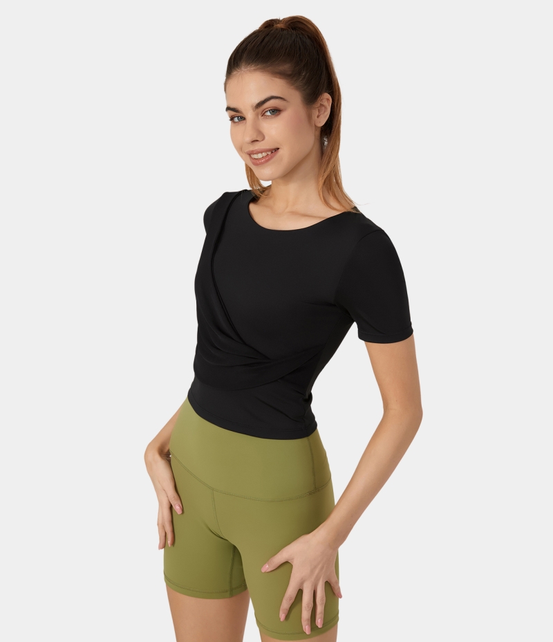 :: Halara Round Neck Short Sleeve Twisted Yoga Sports Women's Tops Black | QZCMNTW-47