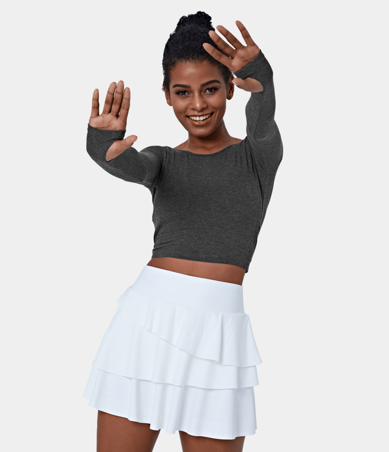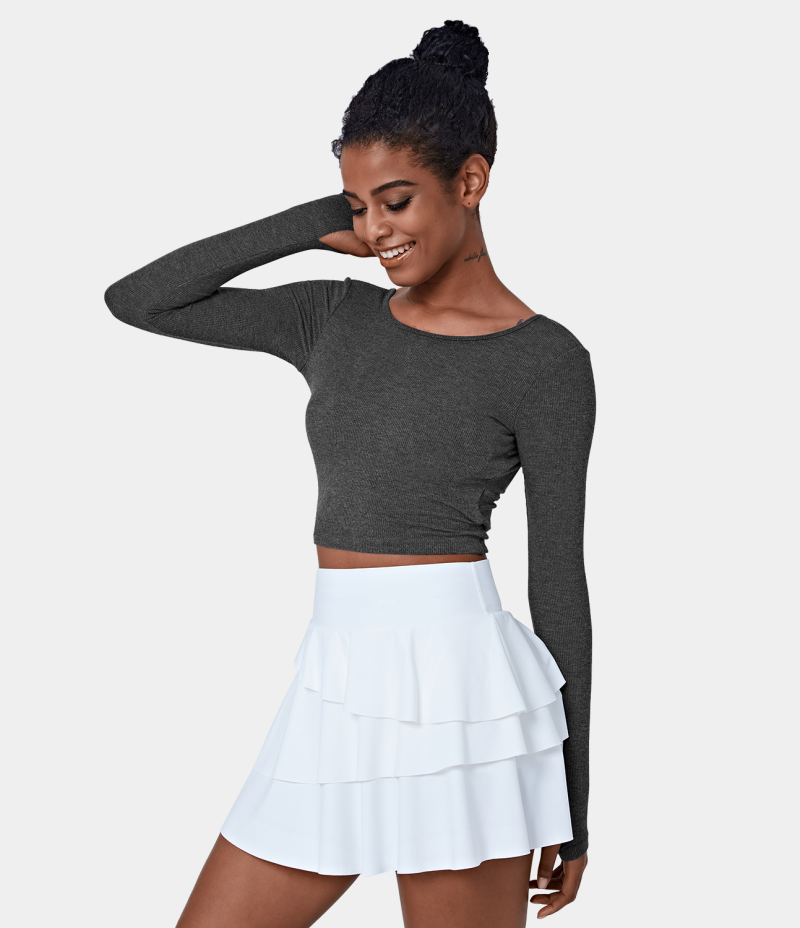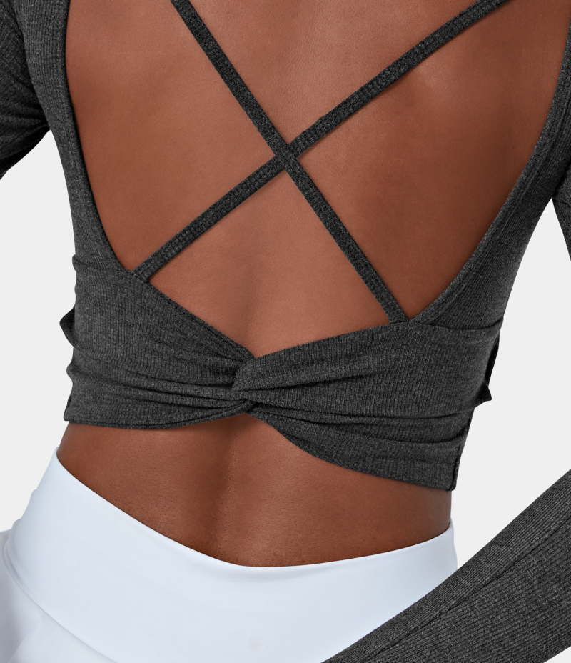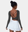 :: Halara Round Neck Thumb Hole Backless Crisscross Twisted Cropped Sports Women's Tops Dark Grey | EWYDPZF-72