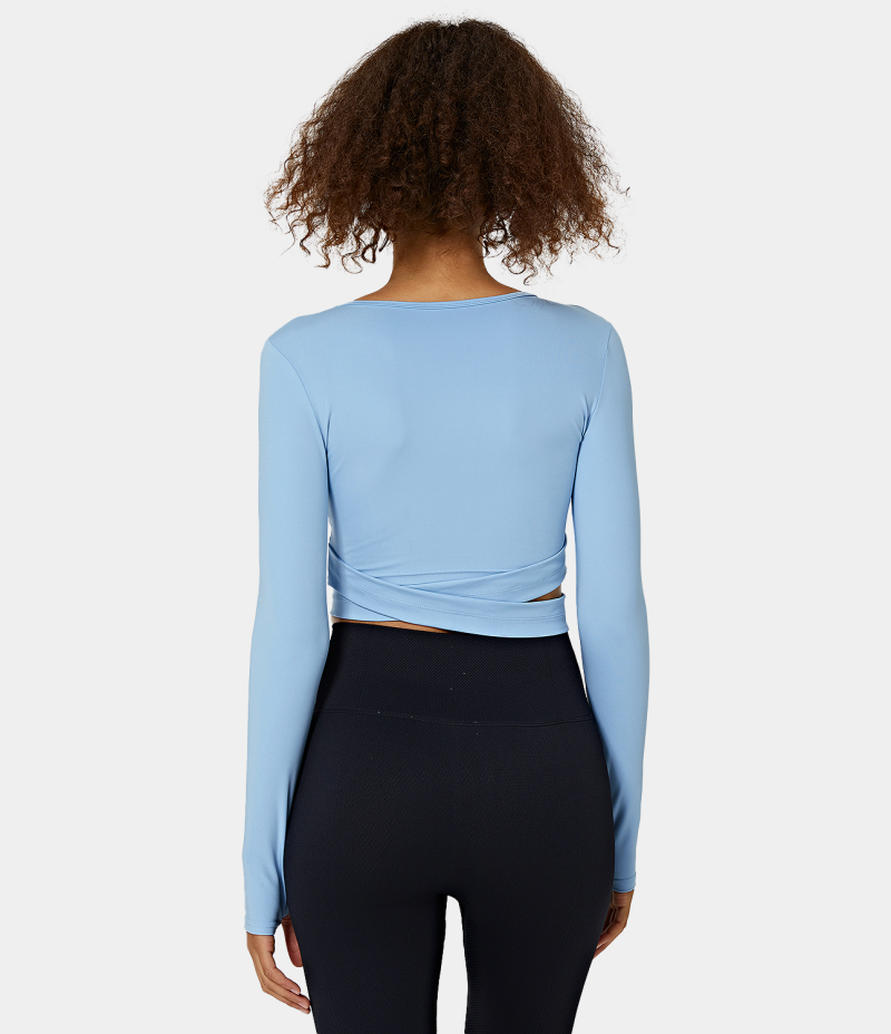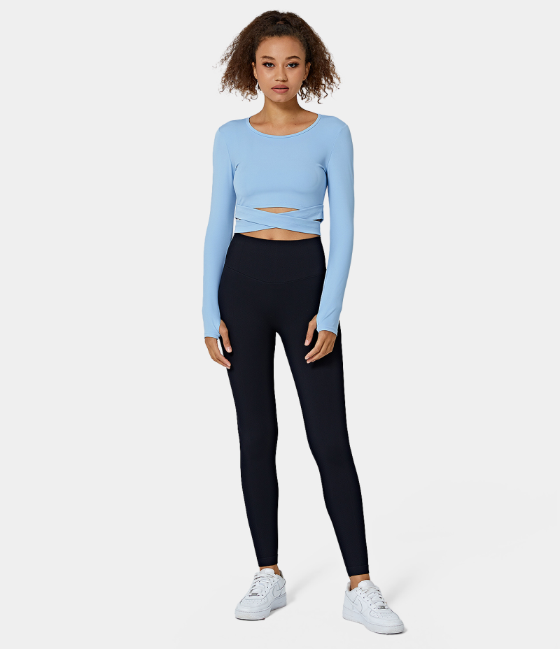 :: Halara Round Neck Thumb Hole Crossover Hem Cropped Sports Women's Tops Carolina Blue | SUEGRTF-25