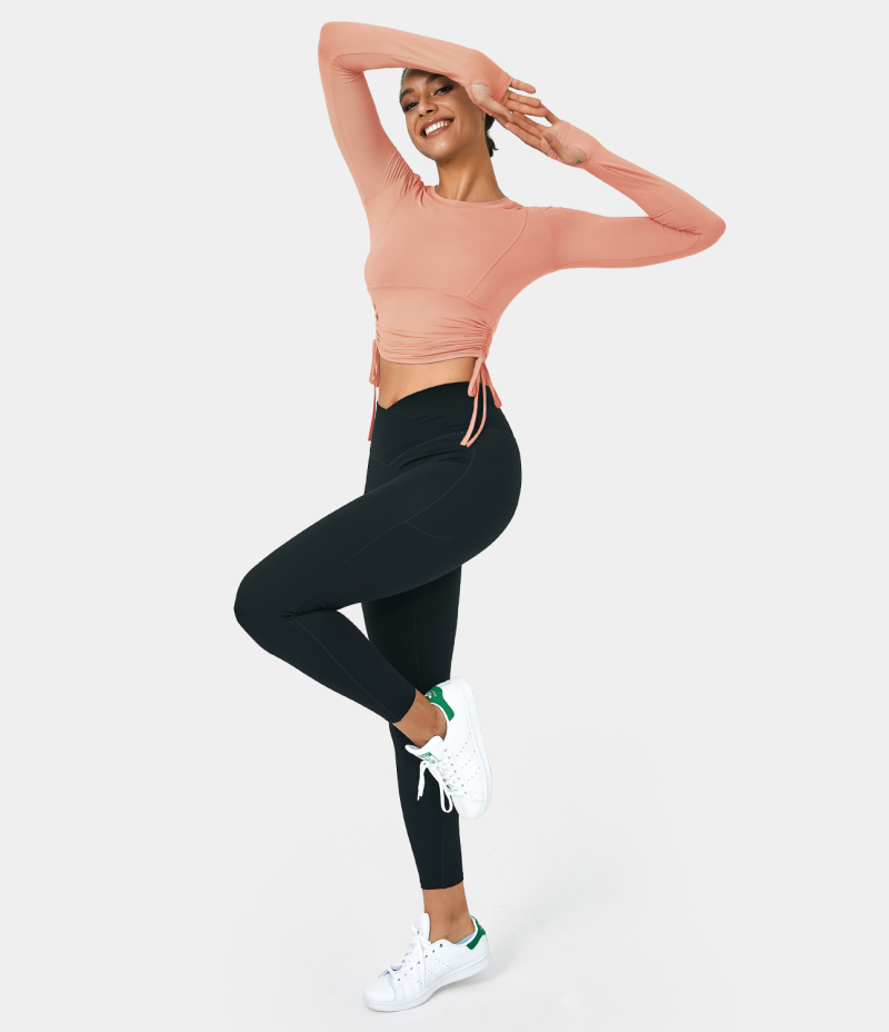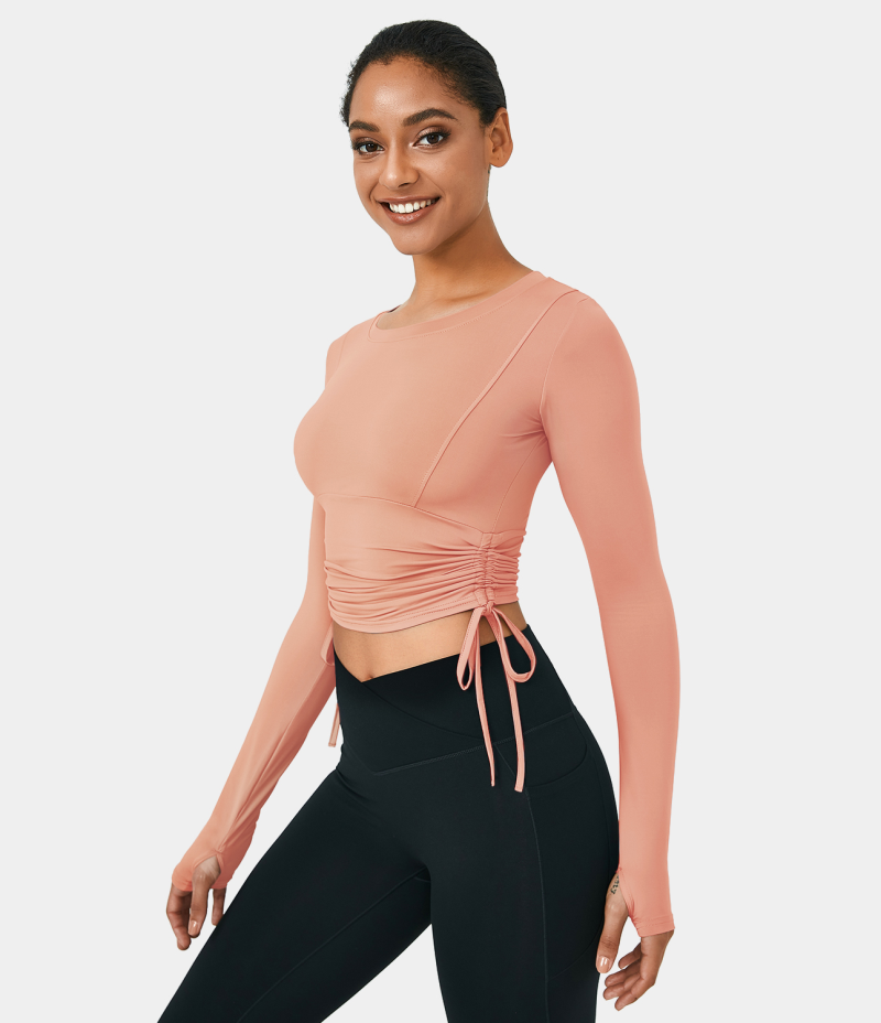 :: Halara Round Neck Thumb Hole Side Drawstring Ruched Cropped Sports Women's Tops Lilac Pink | CINVAPR-83