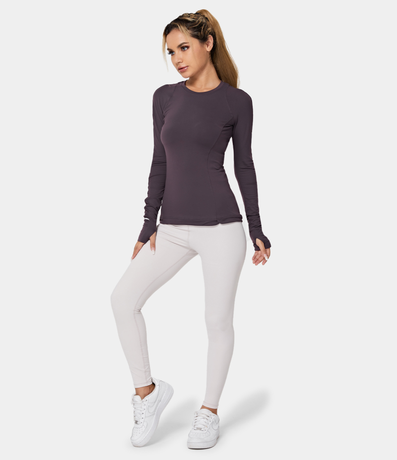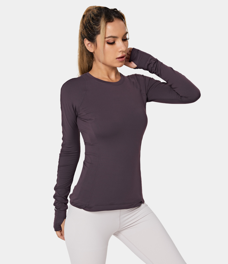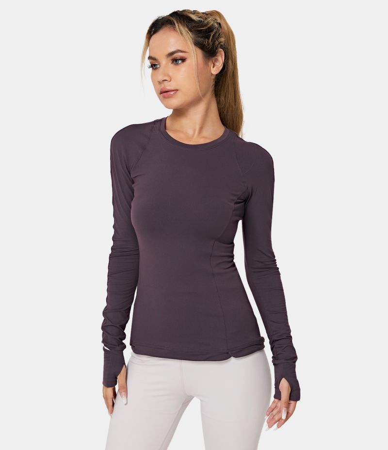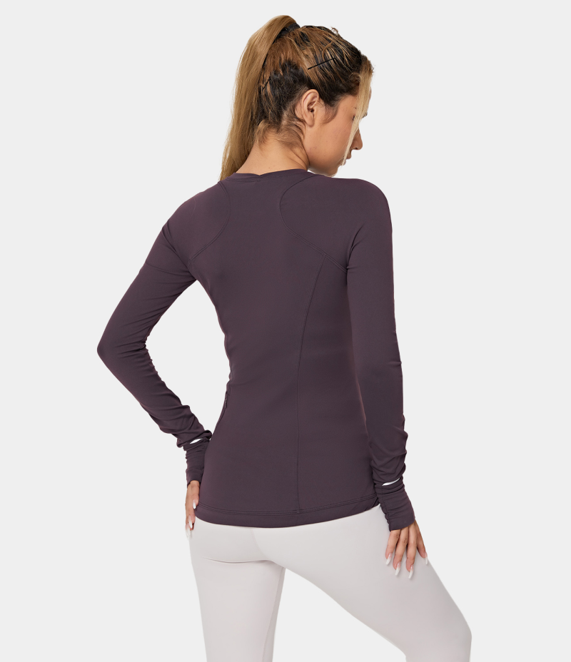 :: Halara Round Neck Thumb Hole Zip Pocket Sports Women's Tops Graphite Purple | JQFBGSR-74