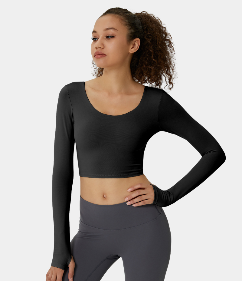:: Halara Scoop Neck Thumb Hole Backless Crisscross Cropped Sports Women's Tops Black | TJWSEIU-97