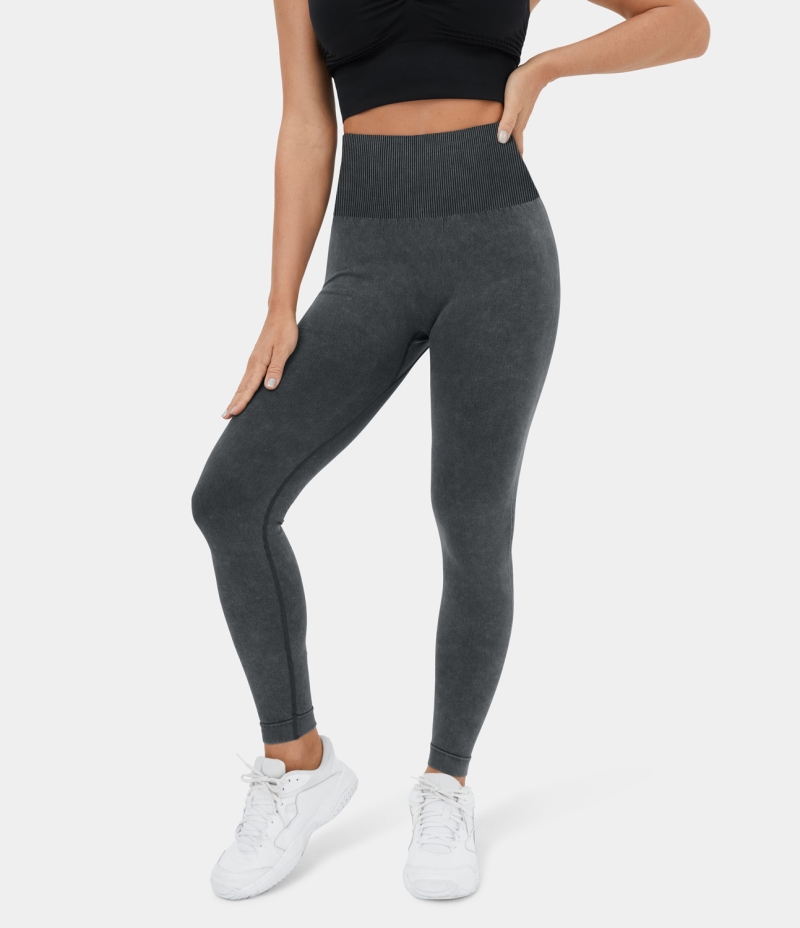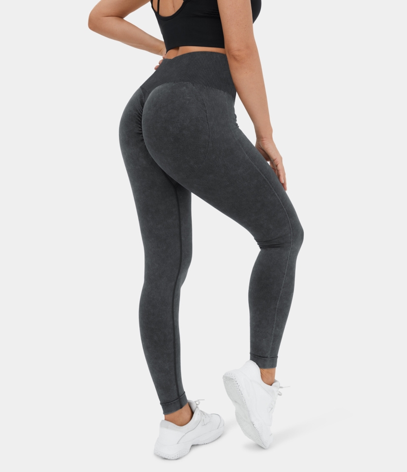 :: Halara Seamless Flow High Waisted Ruched Washed Yoga 7/8 Women's Leggings Washed Black | 908546-ACO