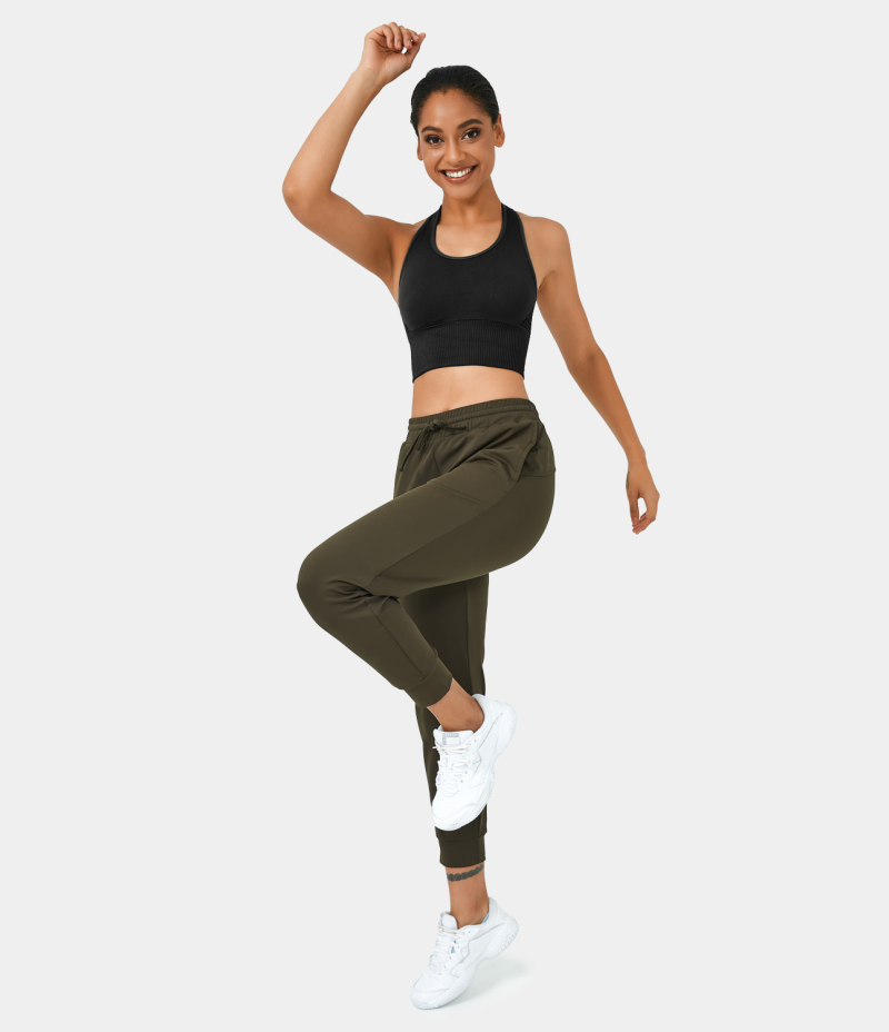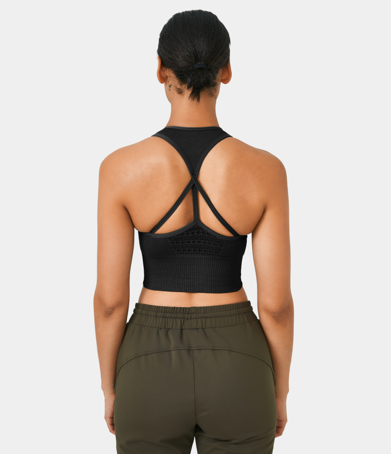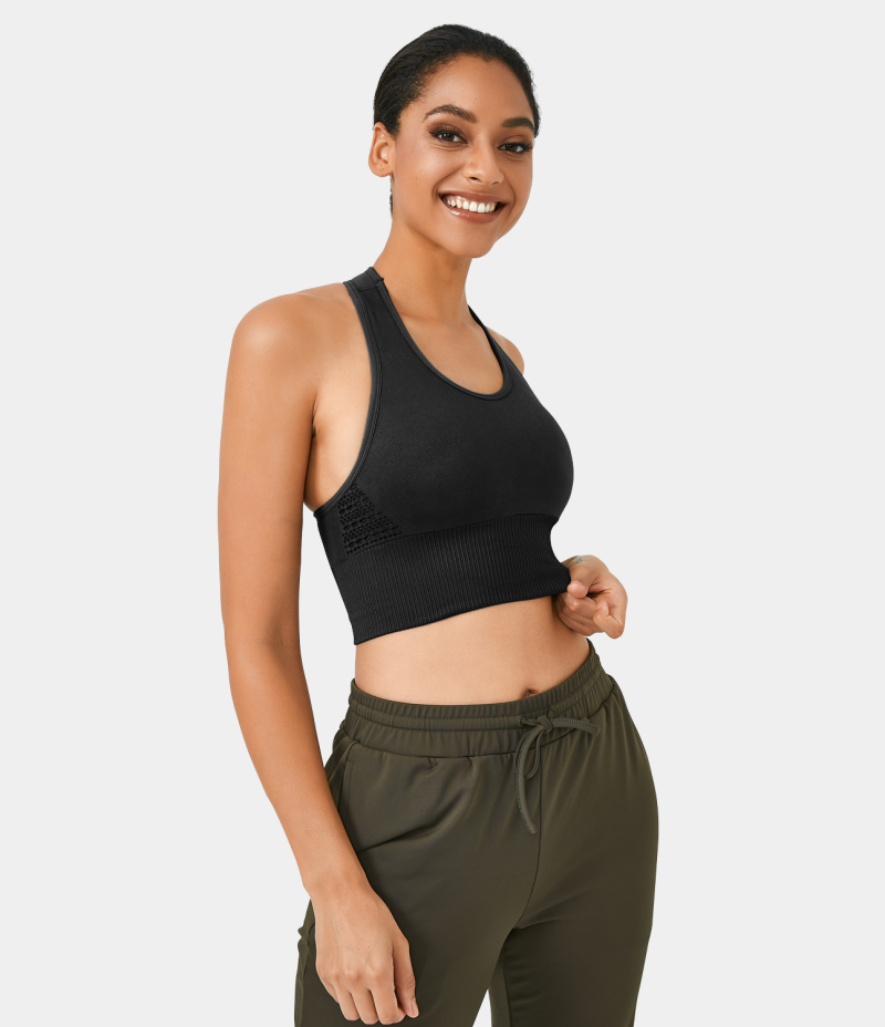 :: Halara Seamless Flow Medium Support Racerback T Back Workout Sports Bra Women's Tops Black | FXSDMHT-38