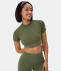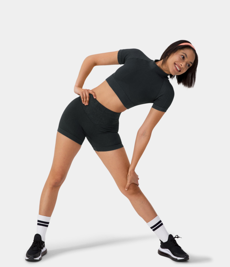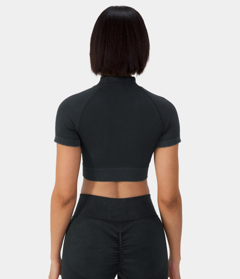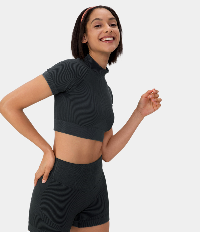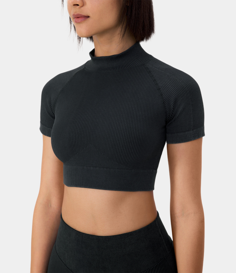 :: Halara Seamless Flow Mock Neck Short Sleeve Cropped Sports Women's Tops Black | YTCSRUW-69