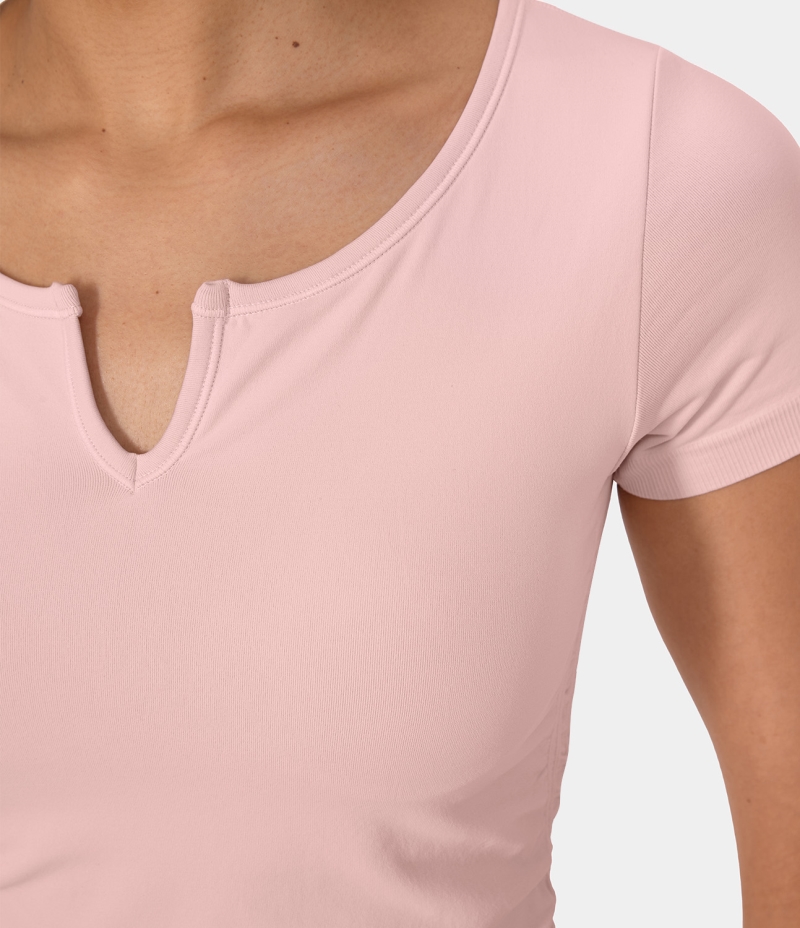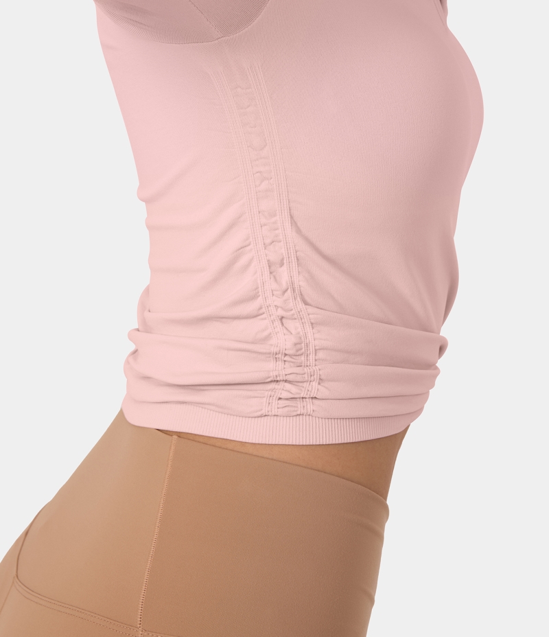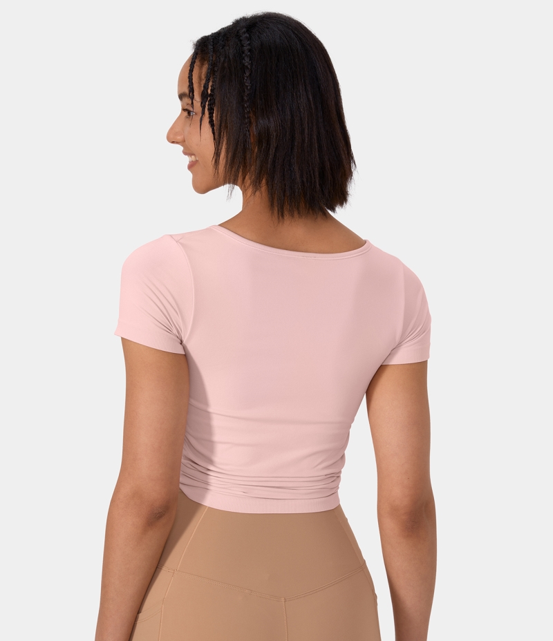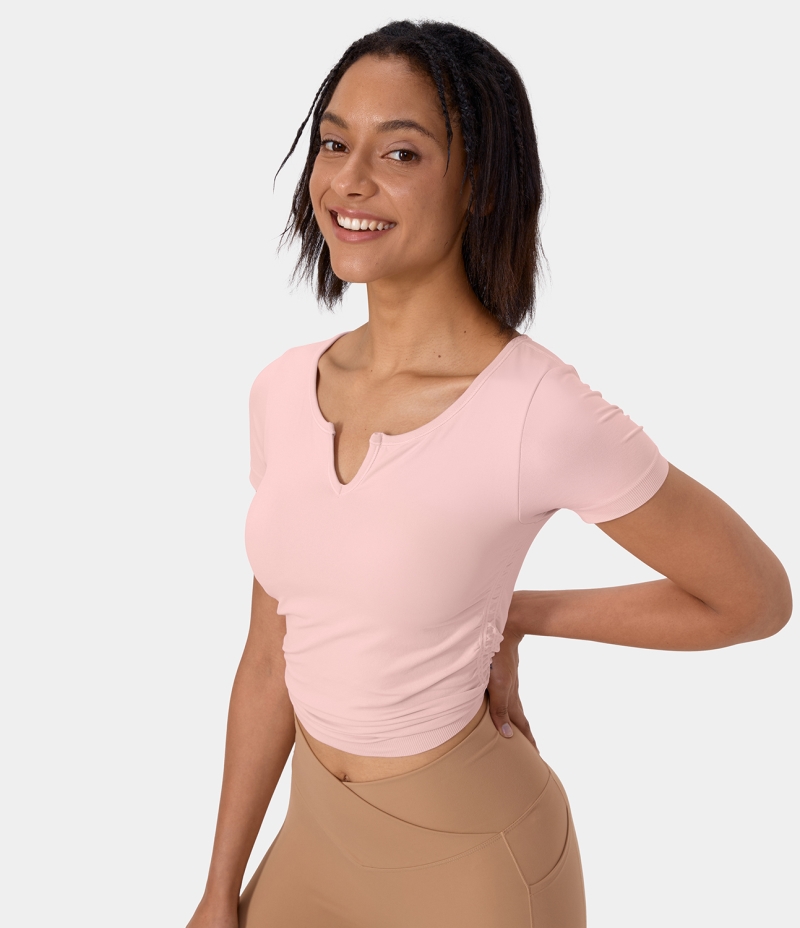:: Halara Seamless Flow Short Sleeve Ruched Cropped Sports Women's Tops Putty Pink | QHXUWNE-51