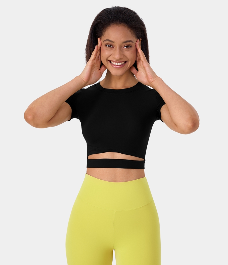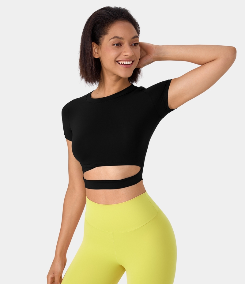 :: Halara Short Sleeve Cut Out Cropped Yoga Sports Women's Tops Black | WLMNPSD-56