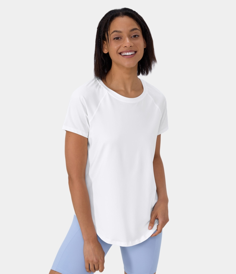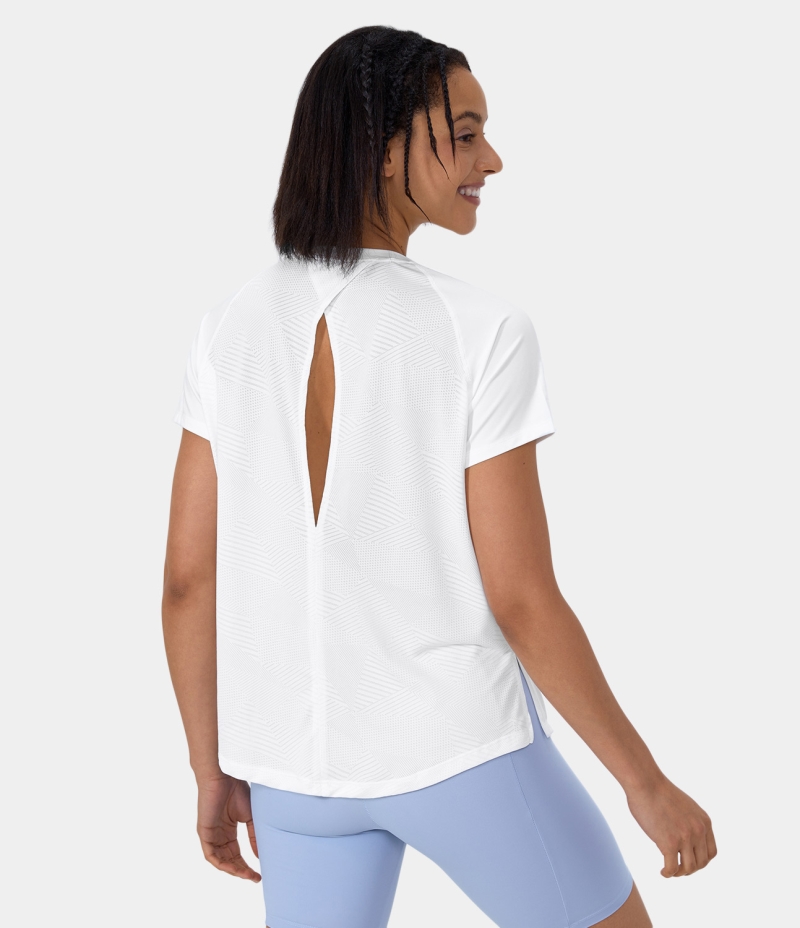 Halara Short Sleeve Split Hem Cut Out Jacquard Yoga Sports Women's Tops White | BDLNKUZ-53