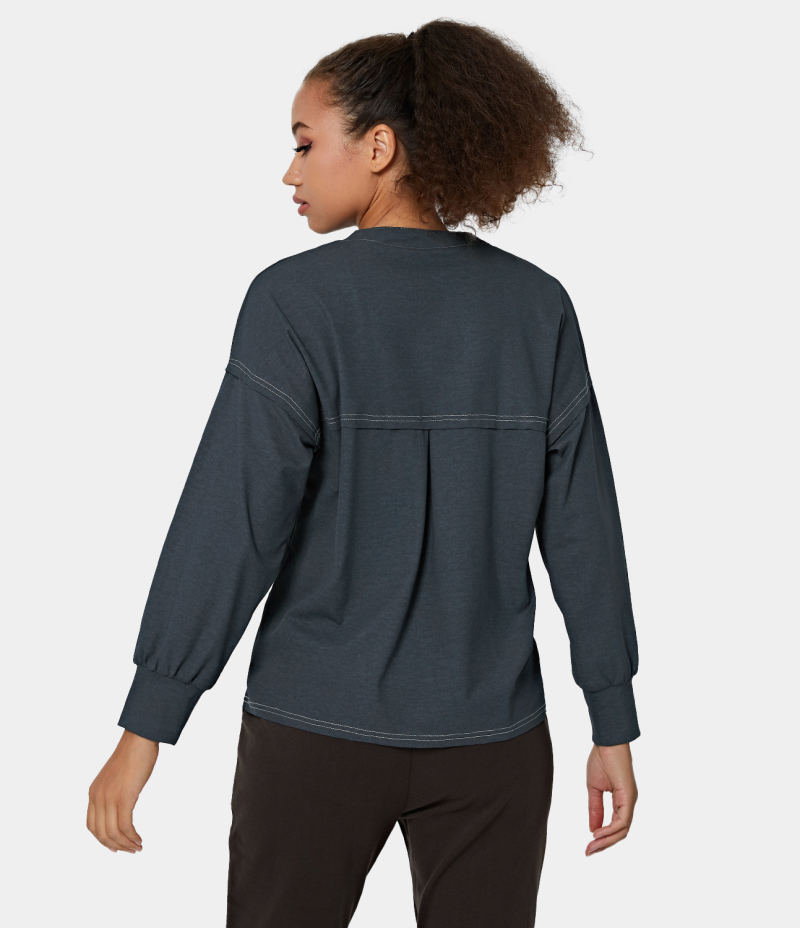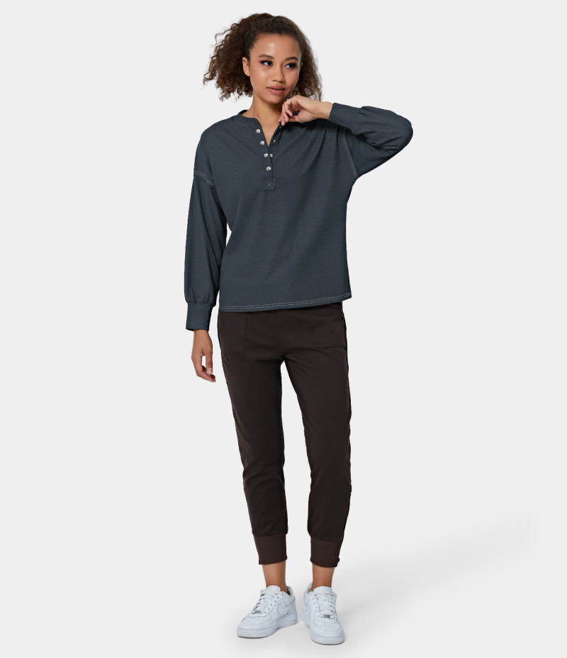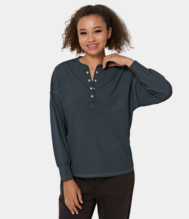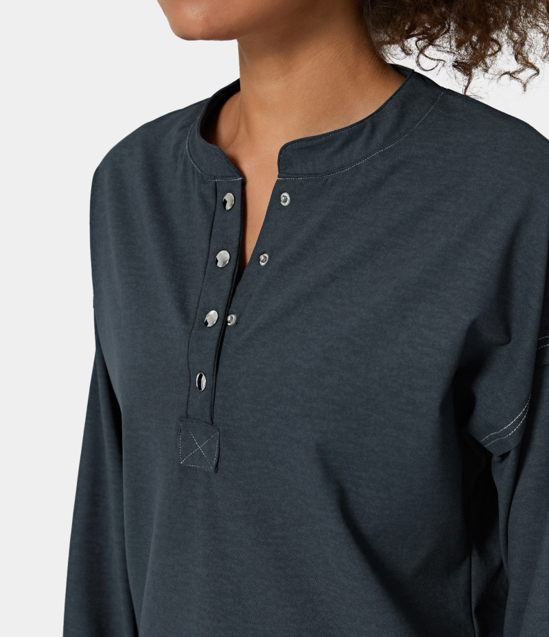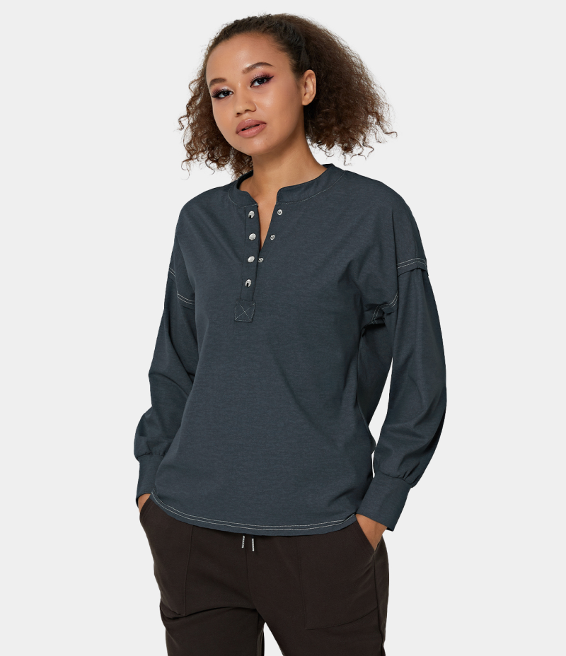 :: Halara Solid Round Neck Button Front Long Sleeve Women's Tops Space Blue | ISWVRHK-31