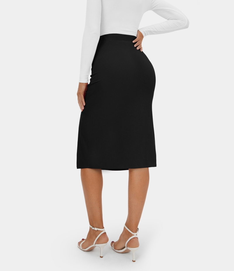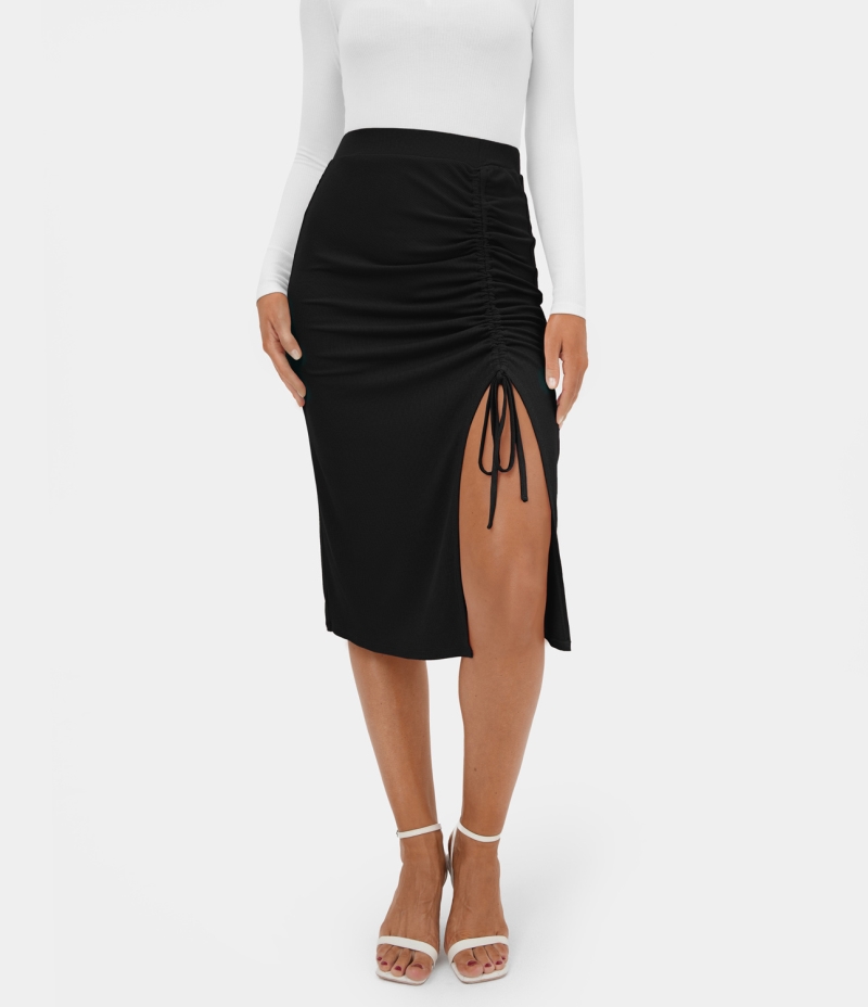 :: Halara Solid Ruched Drawstring Split Bodycon Midi Casual Women's Skirts Black | 107869-SYM