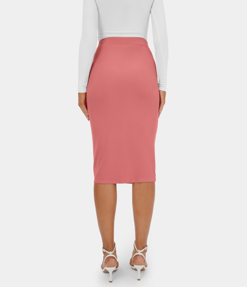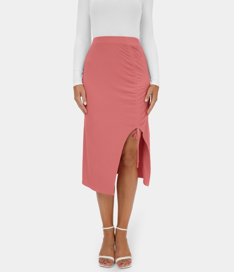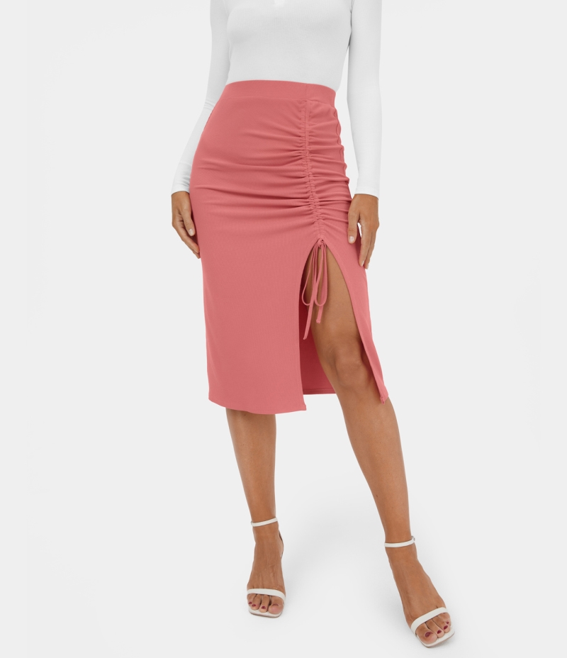 :: Halara Solid Ruched Drawstring Split Bodycon Midi Casual Women's Skirts Faded Rose | 641089-ULJ