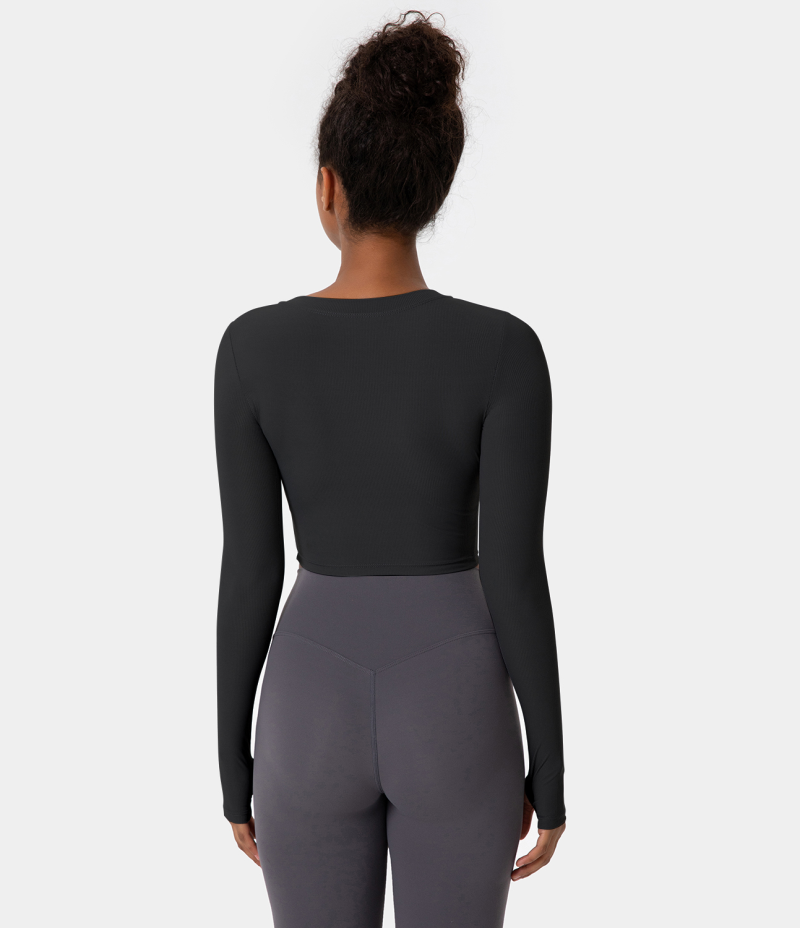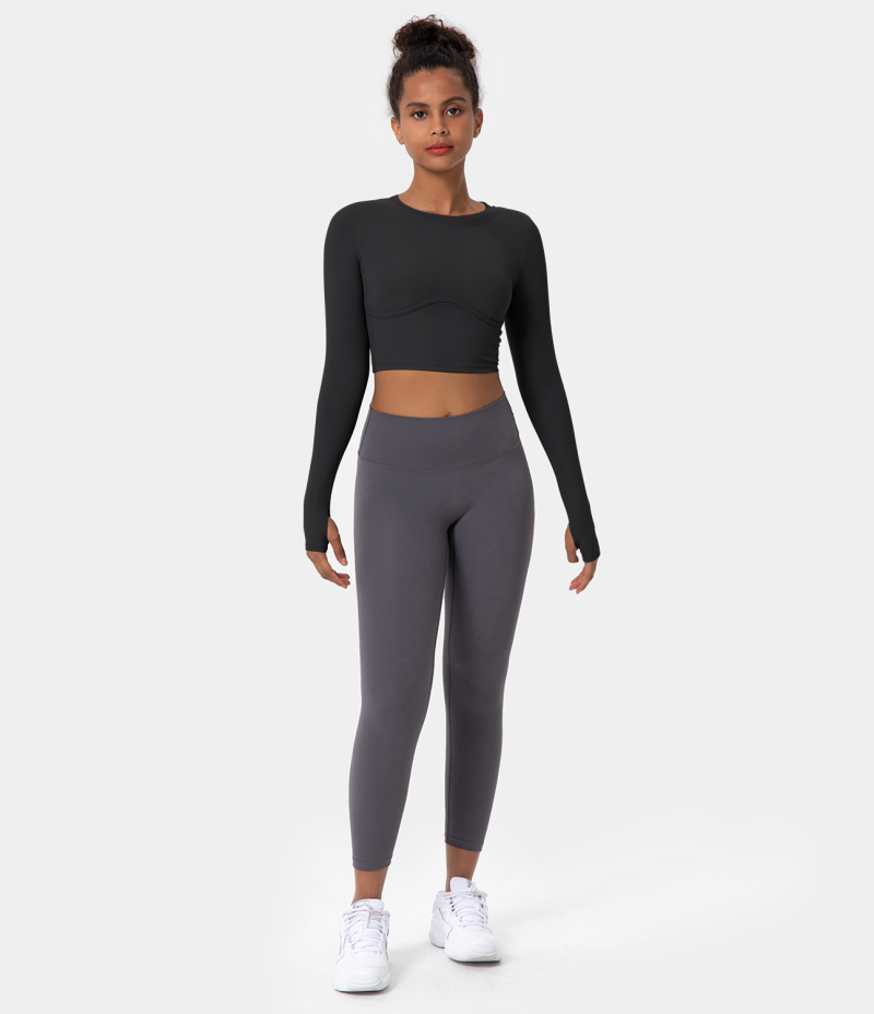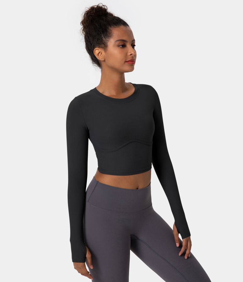 :: Halara Solid Thumb Hole Cropped Sports Women's Tops Black | HITMOZB-03