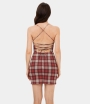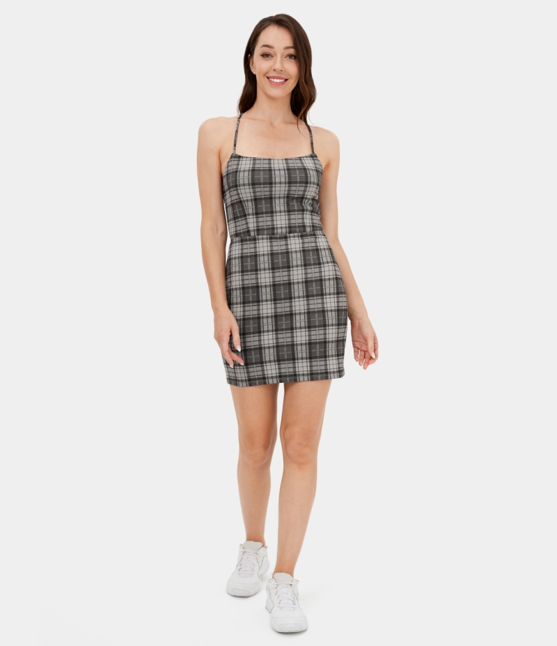 :: Halara Spaghetti Strap Backless Crisscross Lace Up Plaid Bodycon Mini Casual Women's Dress Dark Grey Plaid | 180437-QPR