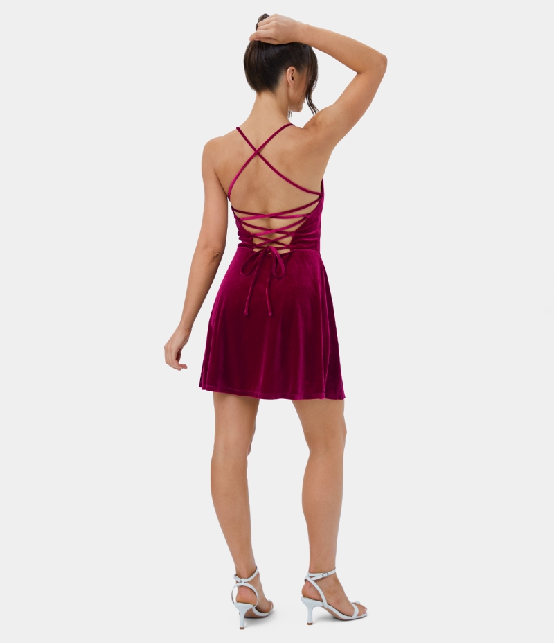 :: Halara Spaghetti Strap Crisscross Lace Up Velvet Mini Casual Women's Dress Biking Red | 026318-VBH