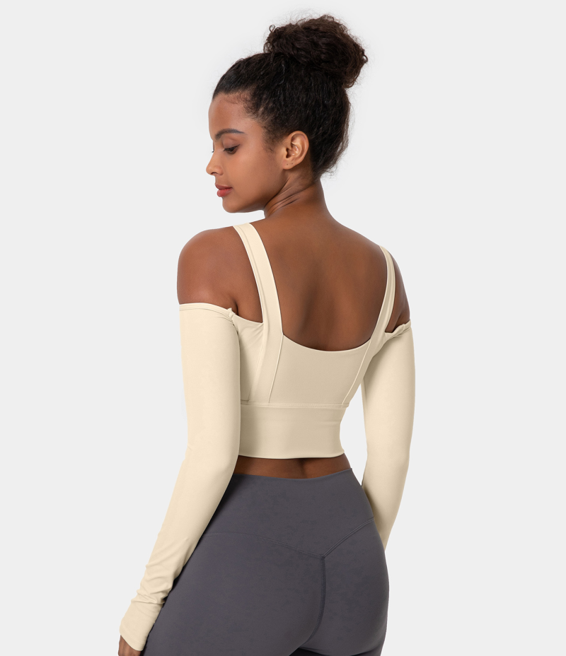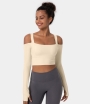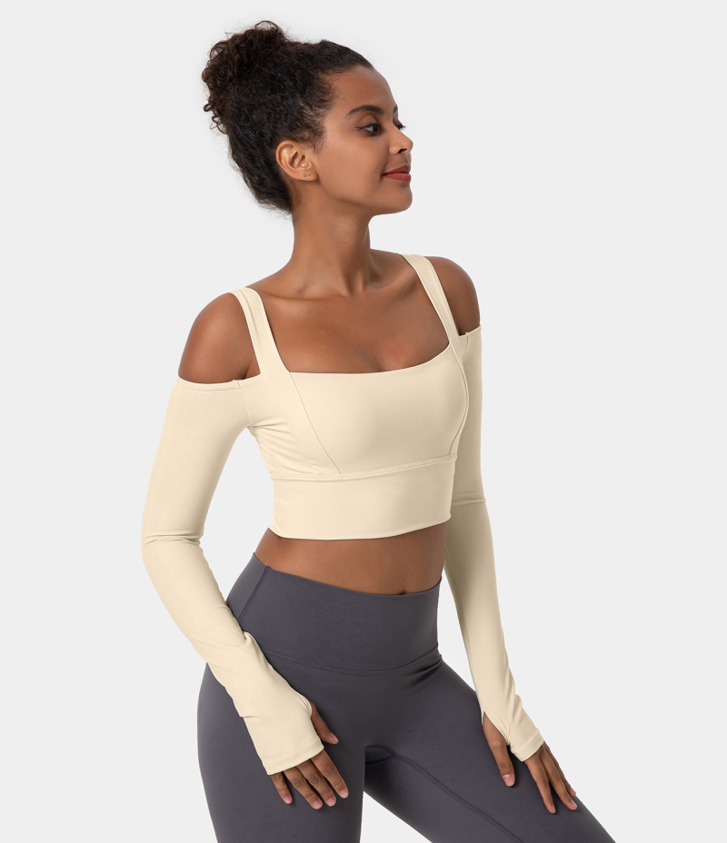 :: Halara Square Neck Cold Shoulder Thumb Hole Cropped Sports Women's Tops Light Beige | QMAEBOZ-24