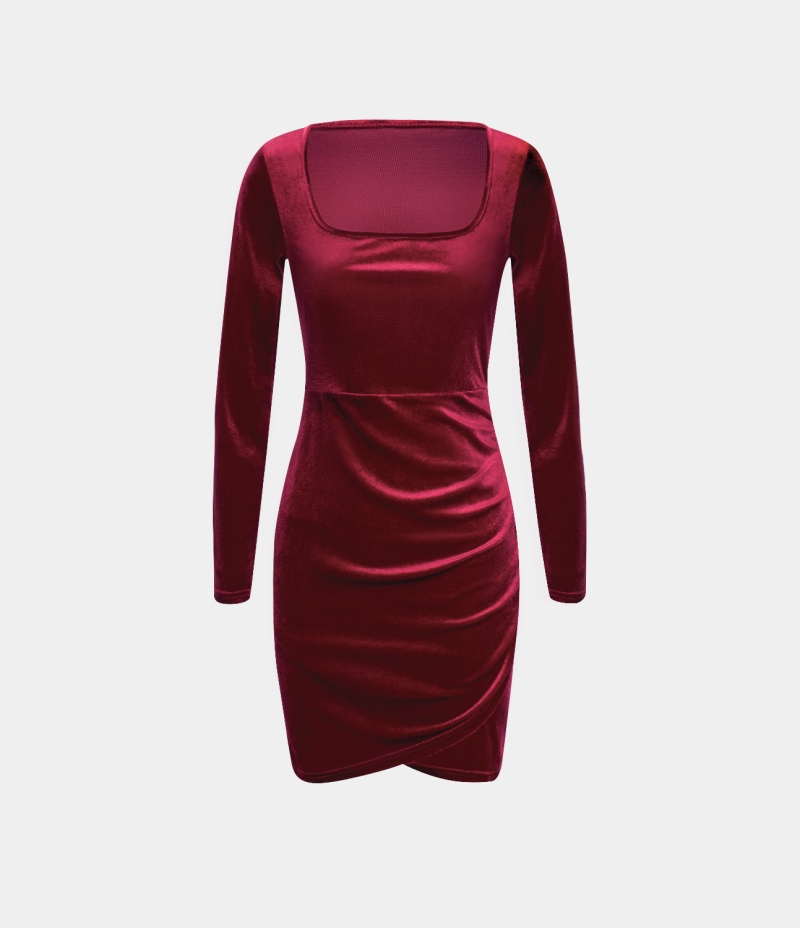 :: Halara Square Neck Long Sleeve Crossover Hem Bodycon Velvet Mini Casual Women's Dress Biking Red | 531807-HEG