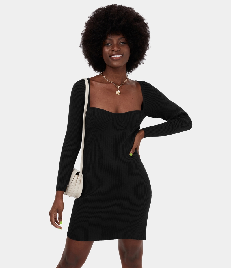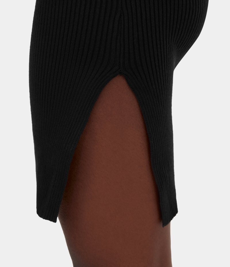 :: Halara Square Neck Split Hem Bodycon Casual Sweater Women's Dress Black | 496138-TPE