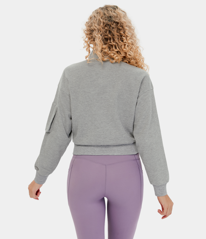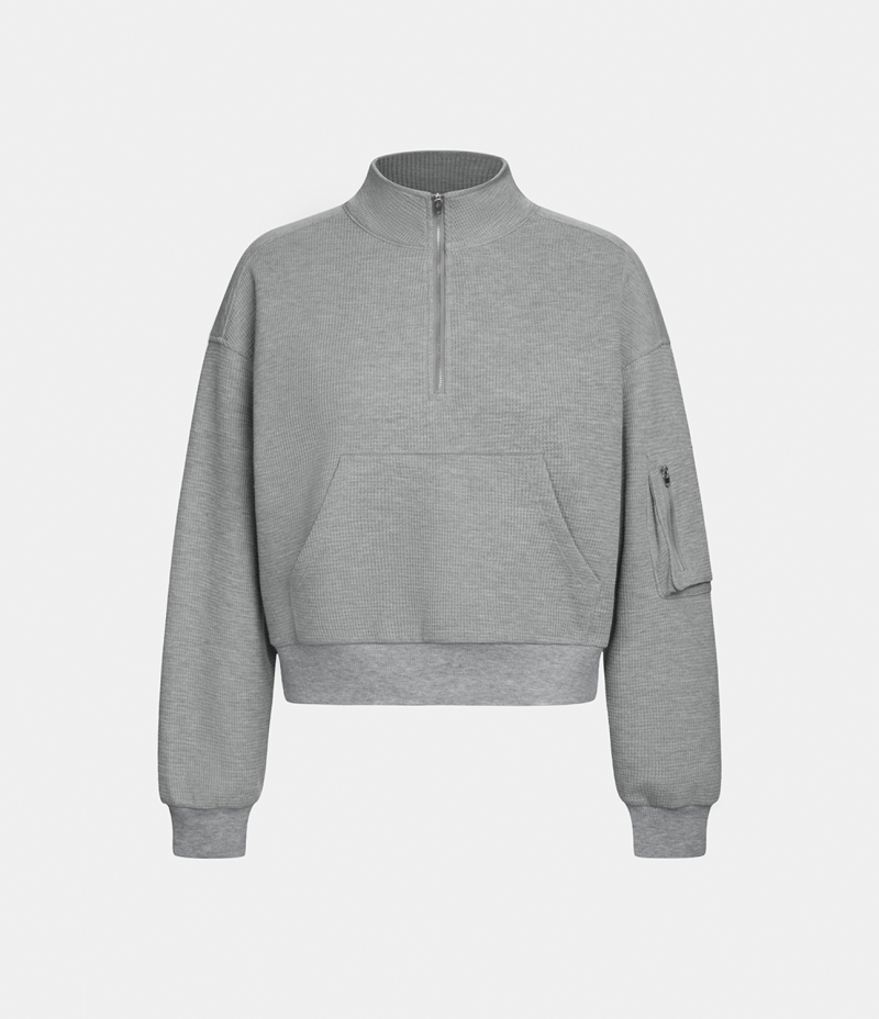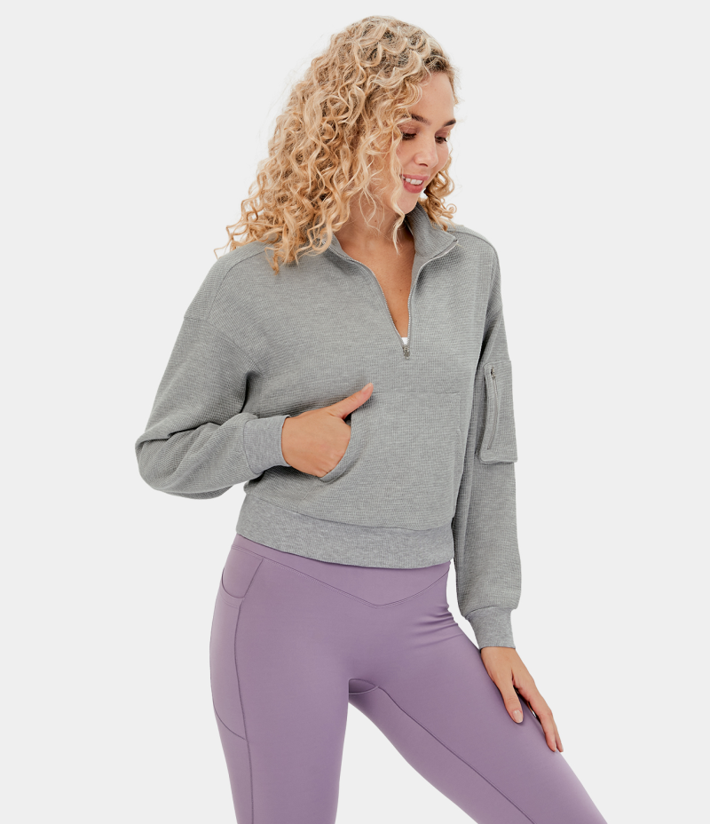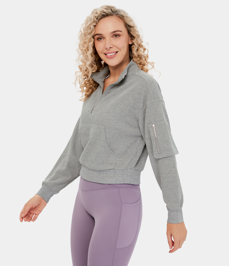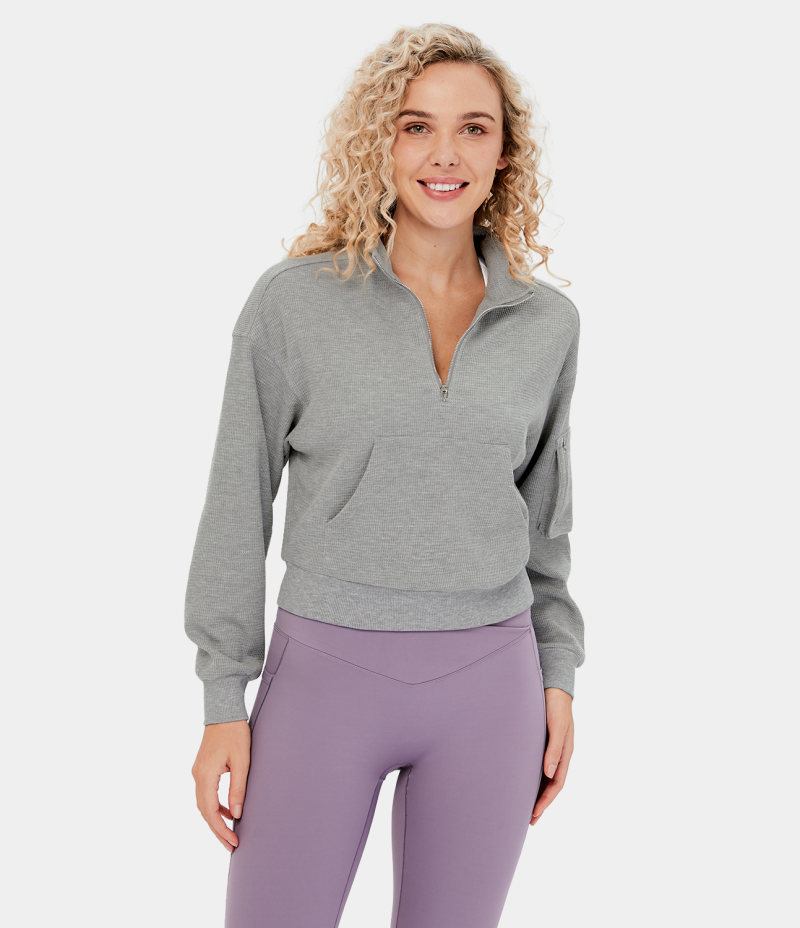 :: Halara Stand Collar Half Zip Dropped Shoulder Kangaroo Pocket Waffle Casual Sweatshirt Women's Tops Limestone | JEPNQFC-12