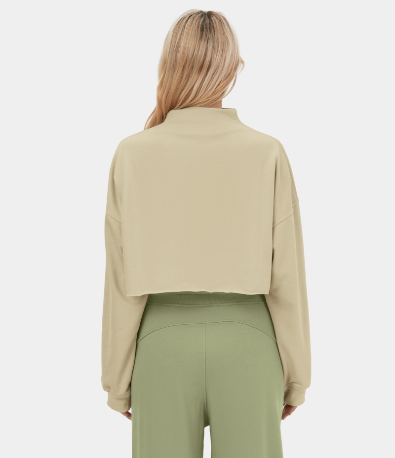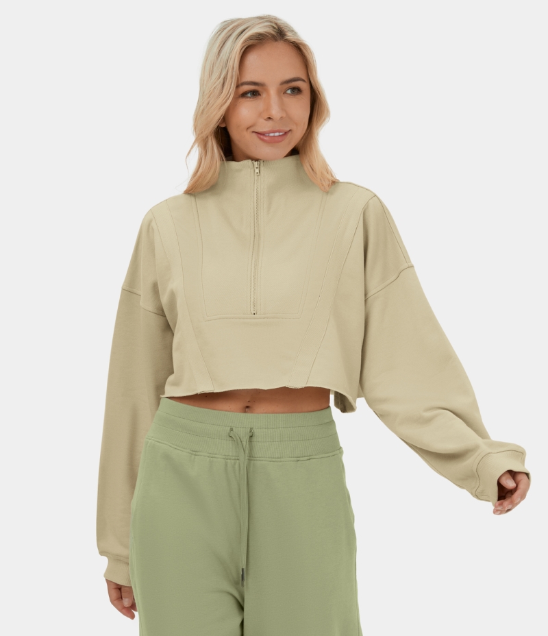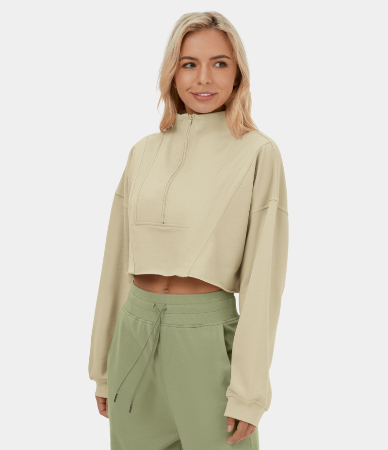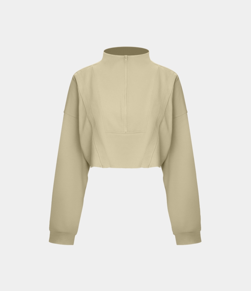:: Halara Stand Collar Half Zip Raw Hem Cropped Casual Sweatshirt Women's Tops Light Beige | CVGNBRE-56
