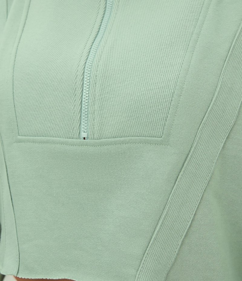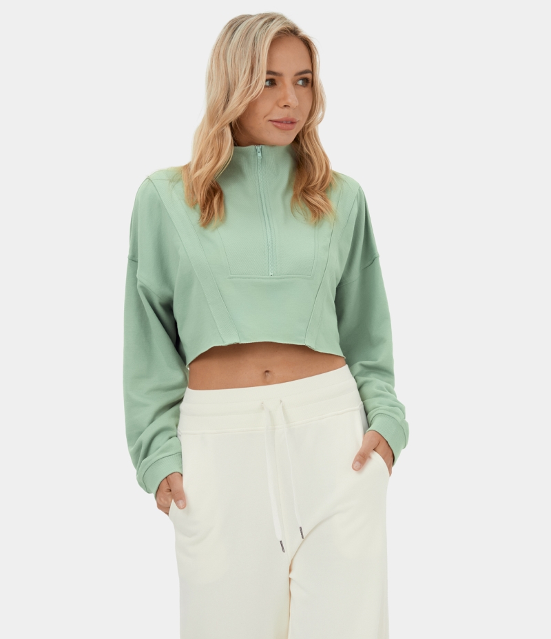 :: Halara Stand Collar Half Zip Raw Hem Cropped Casual Sweatshirt Women's Tops Smoke Green | LHZWCIP-30