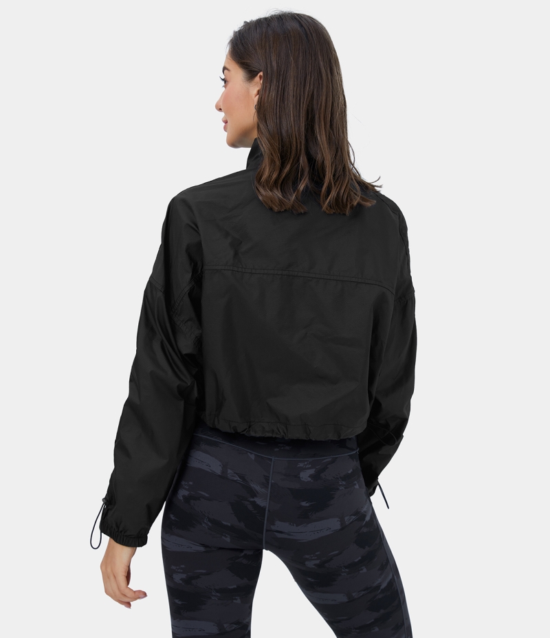 Halara Stand Collar Zip Front Drawstring Side Pocket Sheer Cropped Casual Jacket Women's Tops Black | YTGCZVU-20