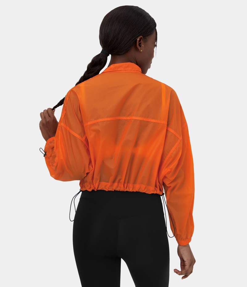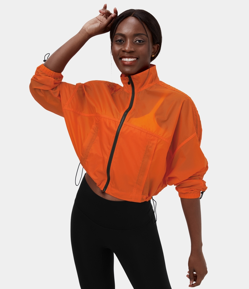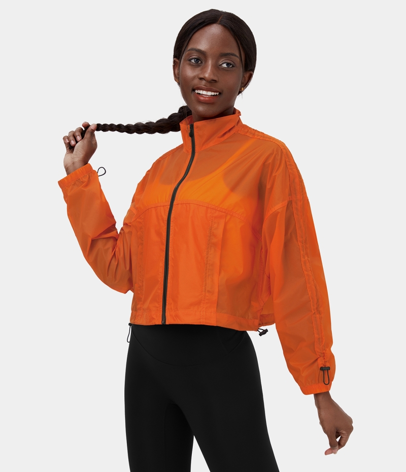 :: Halara Stand Collar Zip Front Drawstring Side Pocket Sheer Cropped Casual Jacket Women's Tops Orange Tiger | XGWNCTA-21