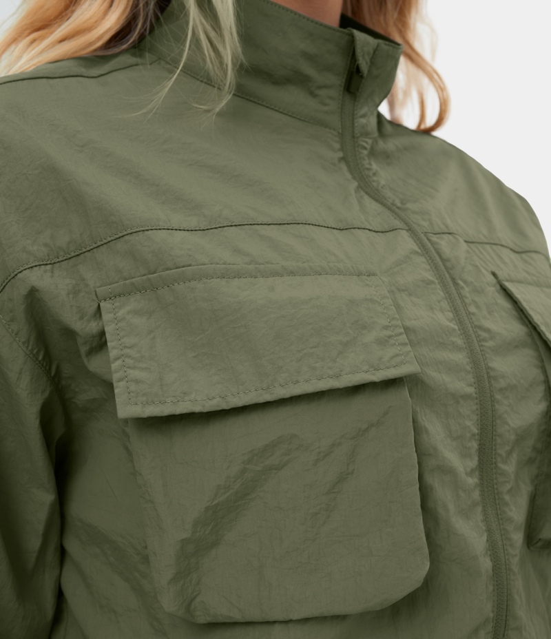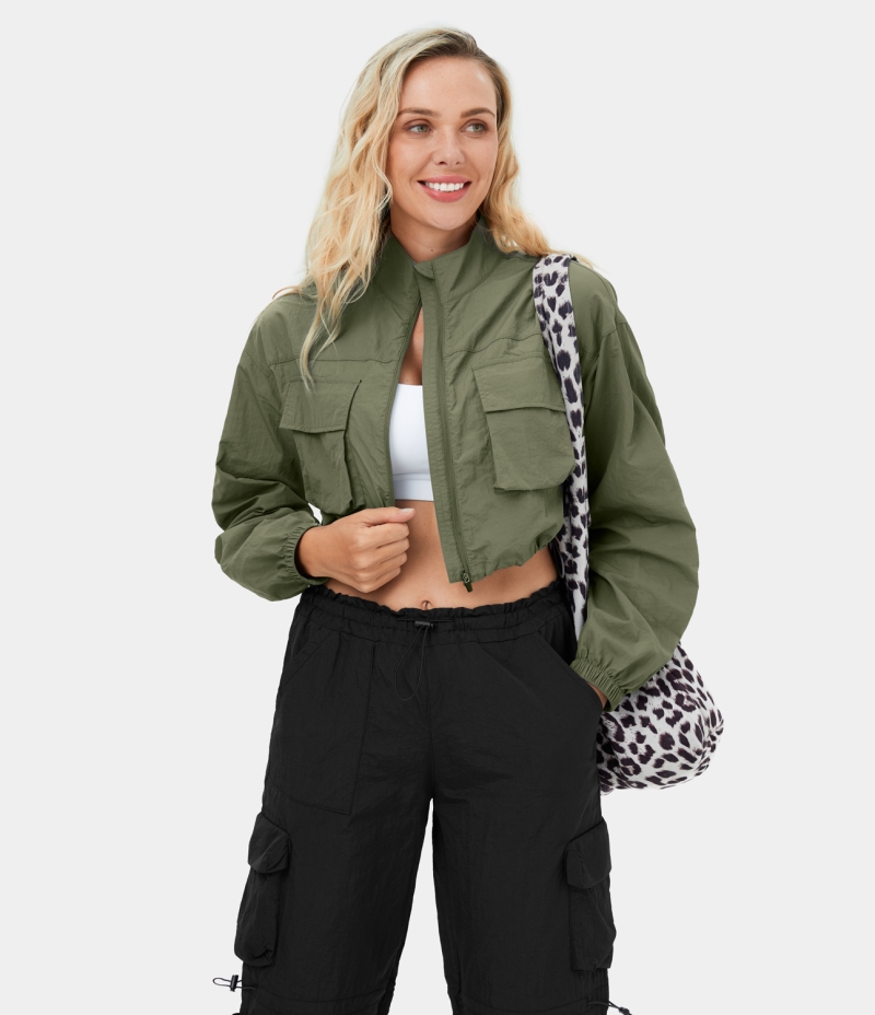 :: Halara Stand Collar Zipper Flap Pocket Drawcord Cropped Casual Cargo Jacket Women's Tops Four Leaf Clover | UZLWXSY-12