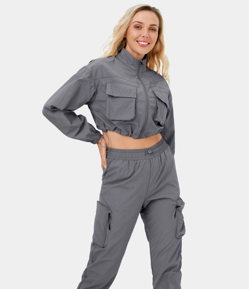 :: Halara Stand Collar Zipper Flap Pocket Drawcord Cropped Casual Cargo Jacket Women's Tops Grey | KTQGDAC-62