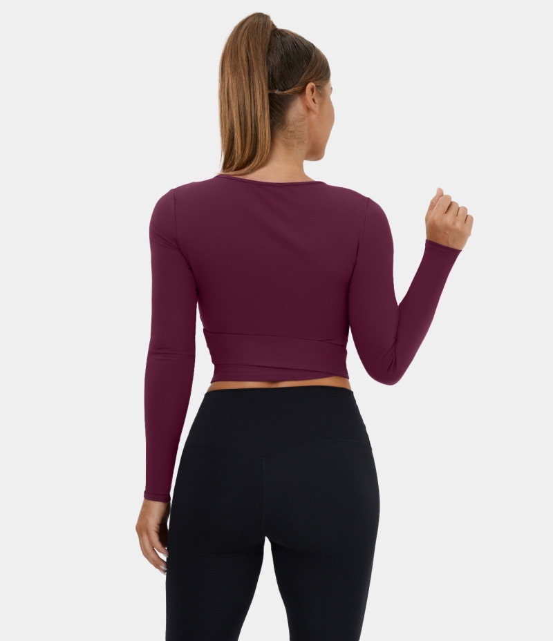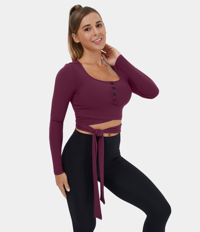 :: Halara U Neck Button Crossover Hem Lace Up Cropped Yoga Sports Women's Tops Red Violet | COLDPEQ-41