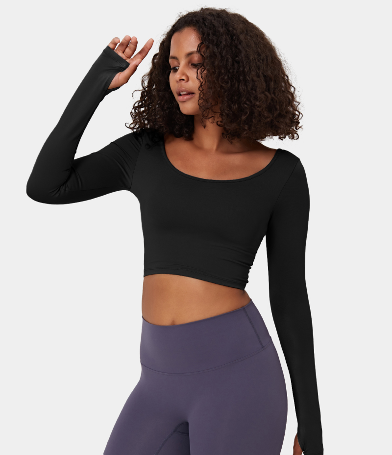 Halara U Neck Thumb Hole Backless Twisted Cropped Sports Women's Tops Black | ZKHFRID-29