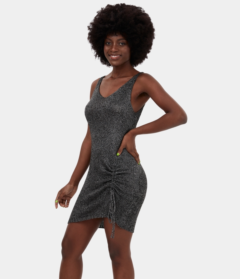 Halara V Neck Backless Side Drawstring Mini Casual Sweater Women's Tops Black | MWDLGBJ-73