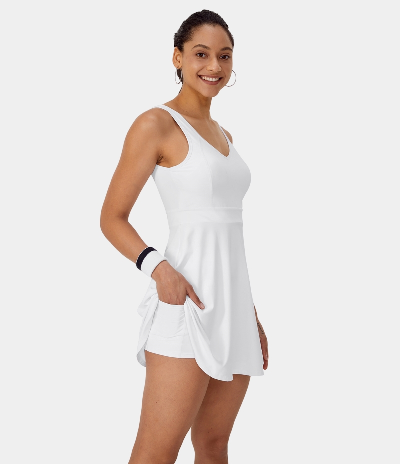 :: Halara V Neck Backless Side Pocket 2-Piece Flare Tennis Women's Dress White | 462173-MAO