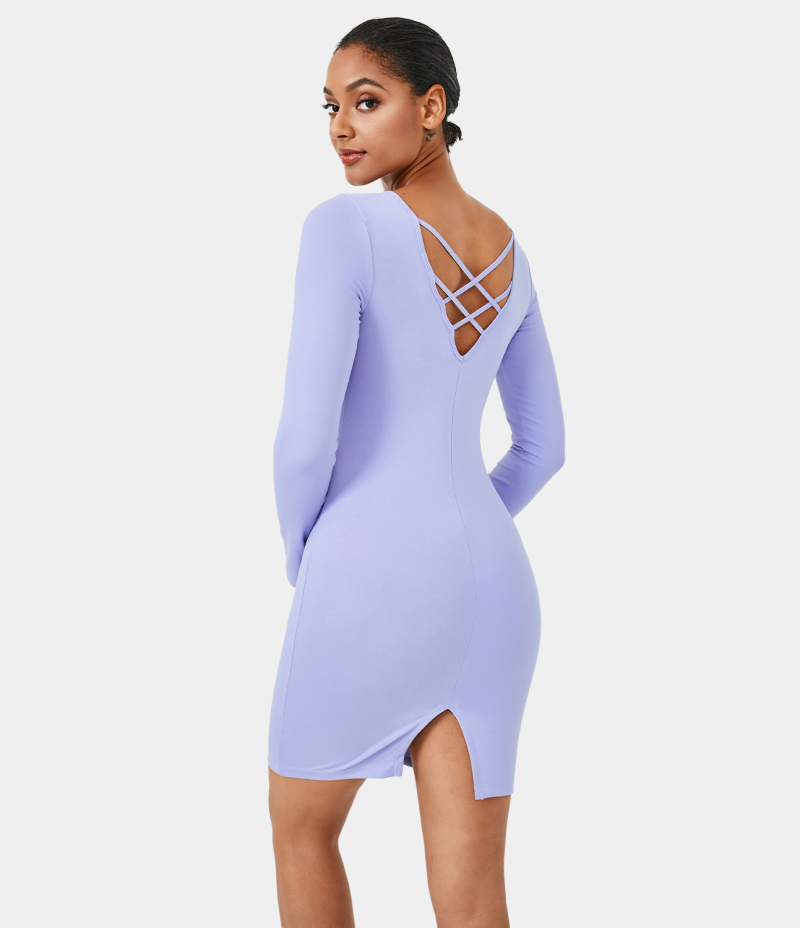 :: Halara V Neck Crisscross Split Hem Plain Women's Dress Light Purple | 435968-WAB