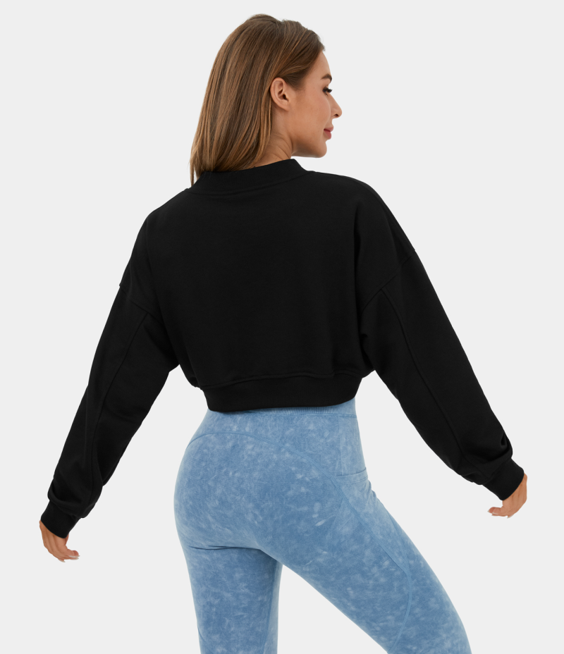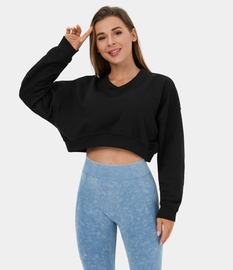 Halara V Neck Dropped Shoulder Cropped Casual Pullover Sweatshirt Women's Tops Black | TAQJZSM-68