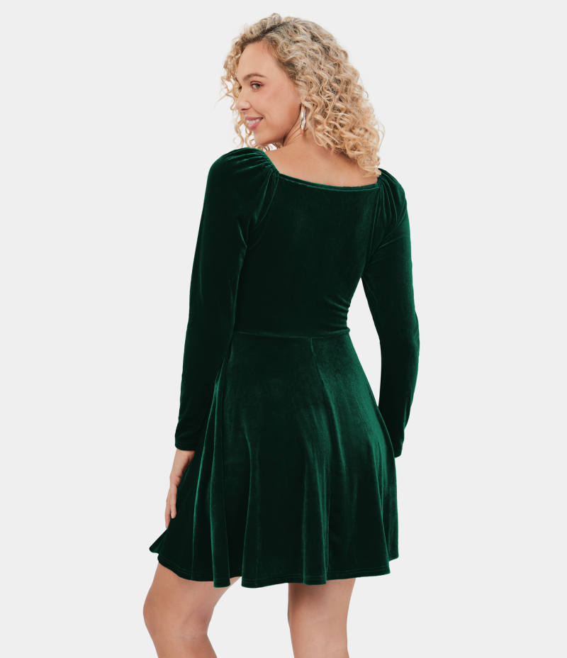 :: Halara V Neck Plicated Side Zipper Velvet Mini Flare Casual Women's Dress Christmas Green | 951607-BUZ