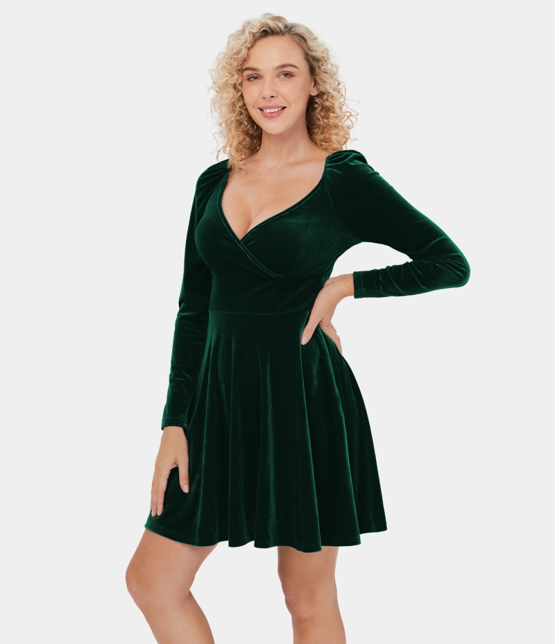 Halara V Neck Plicated Side Zipper Velvet Mini Flare Casual Women's Dress Christmas Green | 951607-BUZ