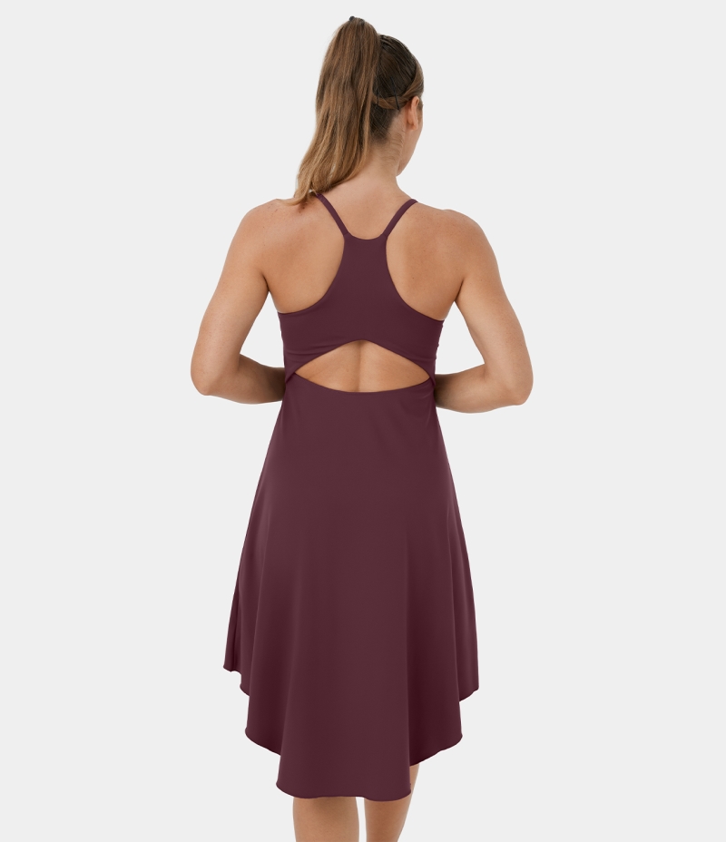 :: Halara V Neck Racerback Cut Out High Low Barre Ballet Dance Women's Dress New Maroon | 340762-MBK