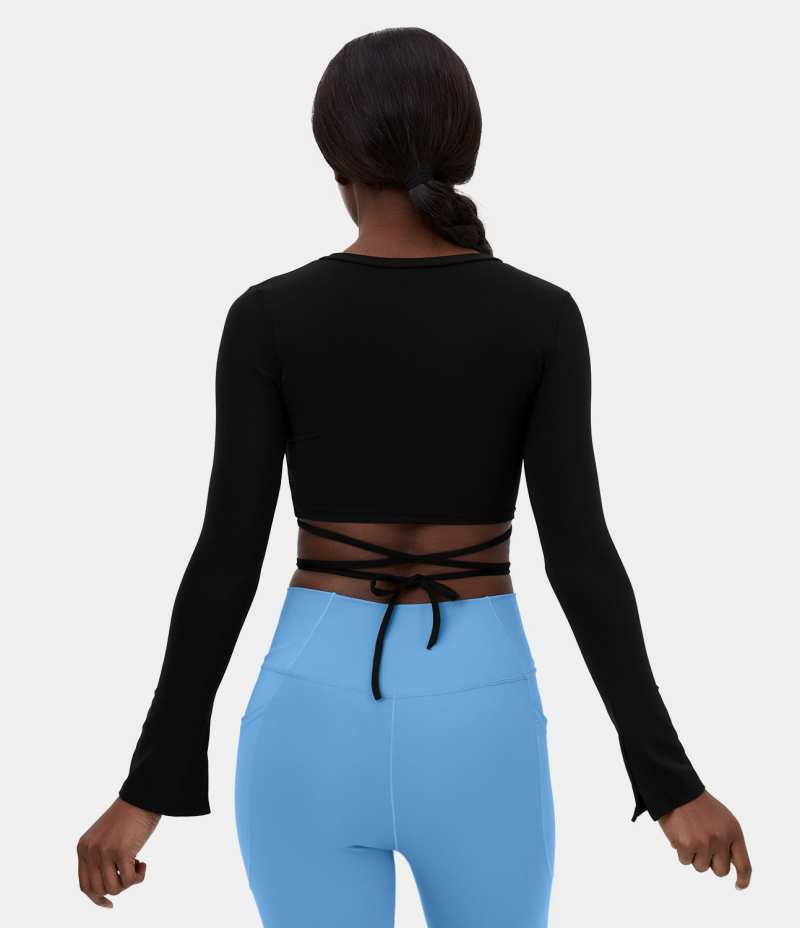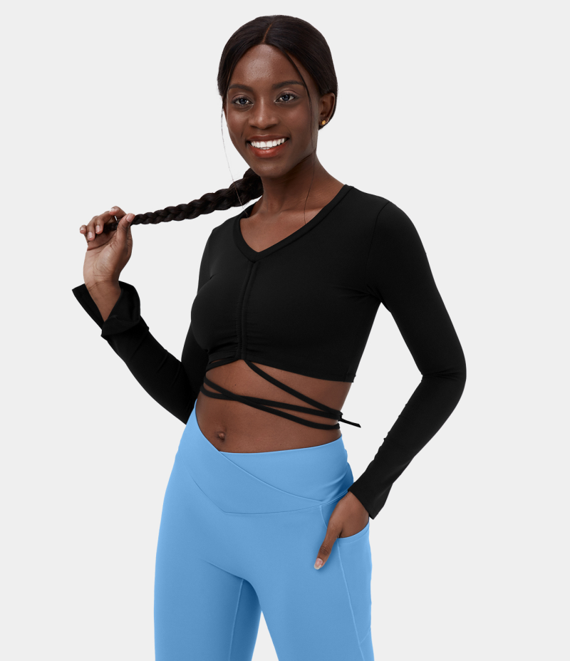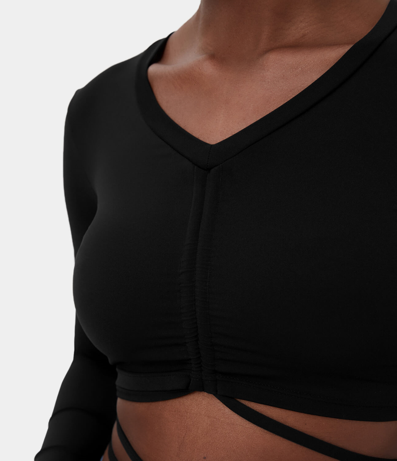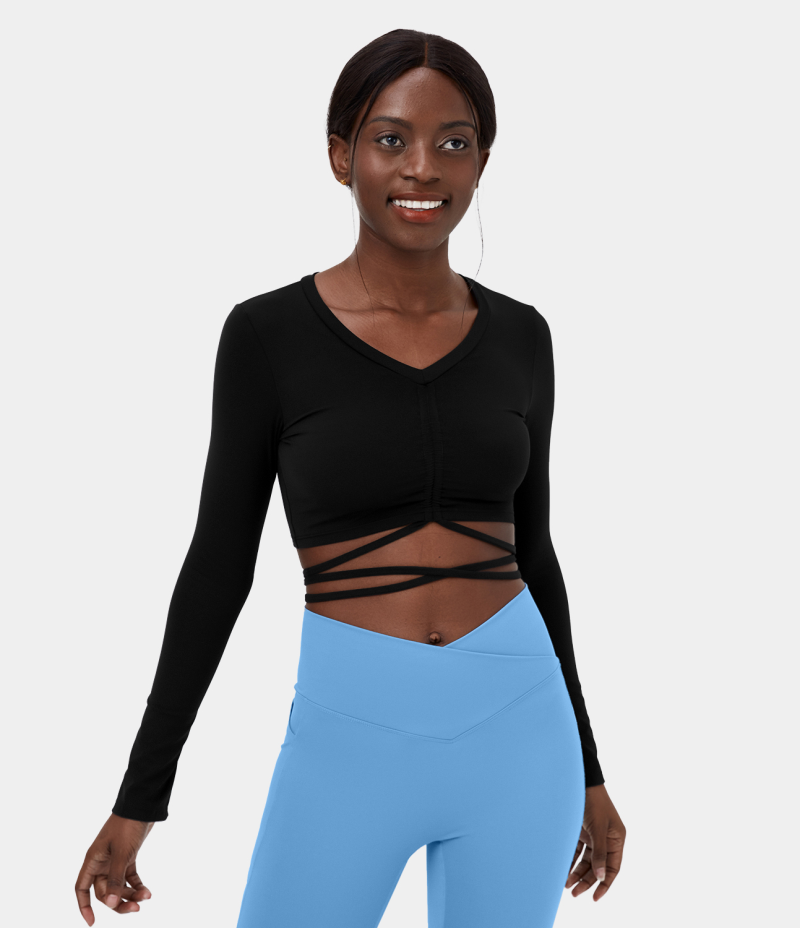 :: Halara V Neck Ruched Crisscross Lace Up Cropped Yoga Sports Women's Tops Black | BDKYXLZ-87