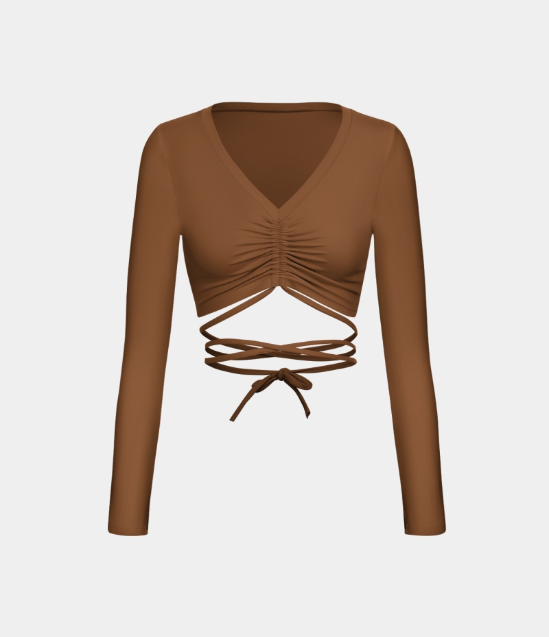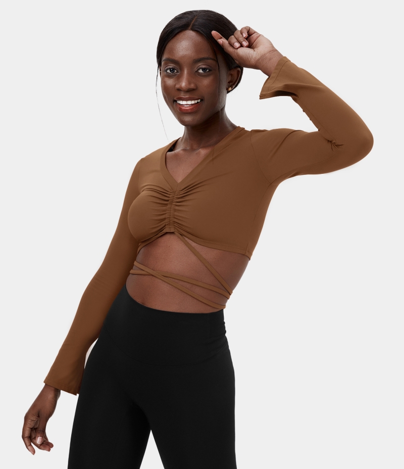 :: Halara V Neck Ruched Crisscross Lace Up Cropped Yoga Sports Women's Tops Brown | AOJCKNF-94