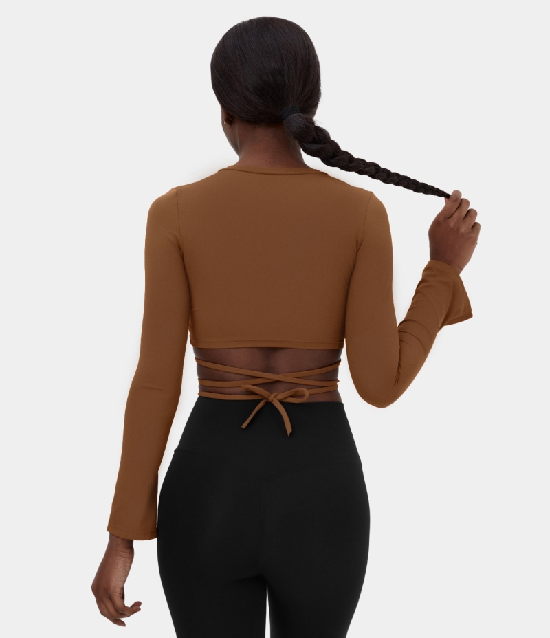 Halara V Neck Ruched Crisscross Lace Up Cropped Yoga Sports Women's Tops Brown | XHEIQGK-43