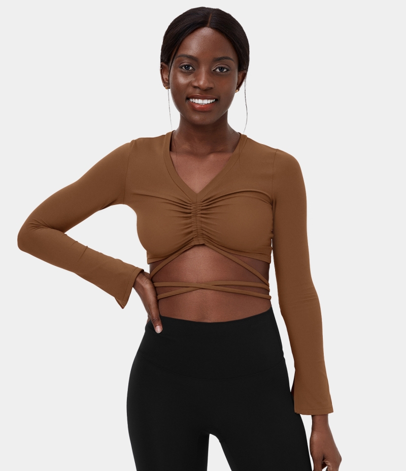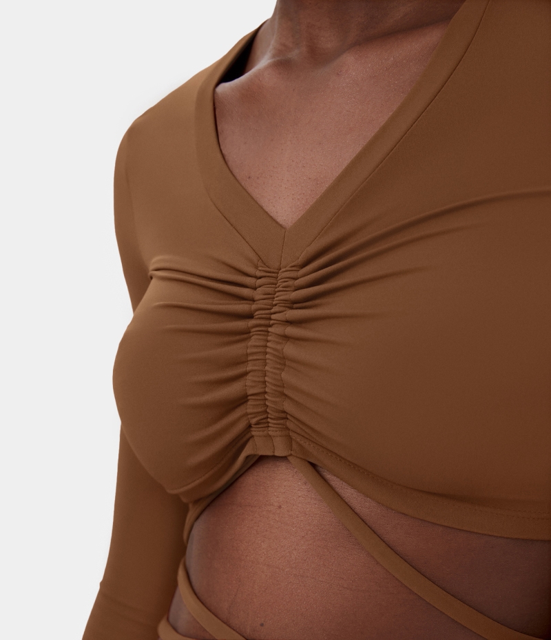 :: Halara V Neck Ruched Crisscross Lace Up Cropped Yoga Sports Women's Tops Brown | XHEIQGK-43