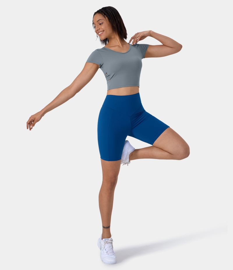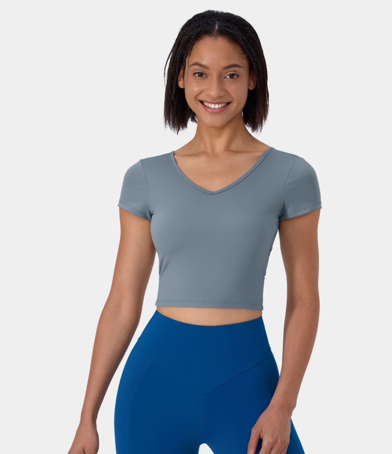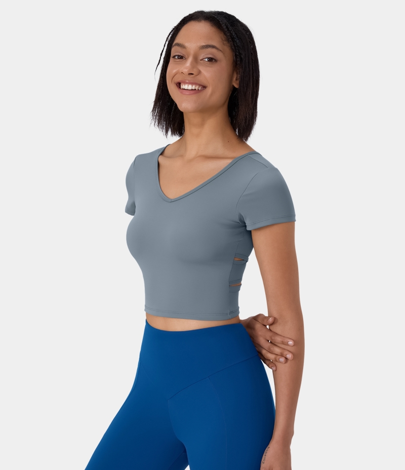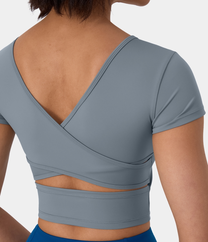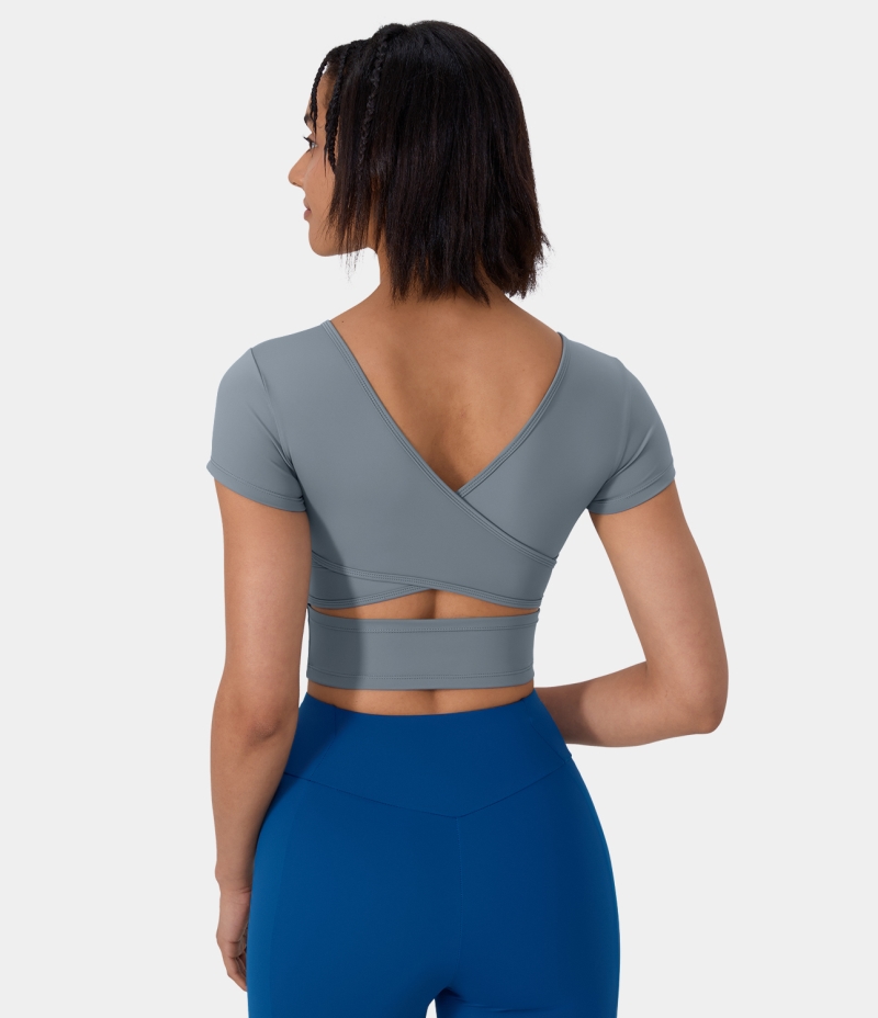 Halara V Neck Short Sleeve Backless Crisscross Cut Out Cropped Barre Ballet Dance Women's Tops Citadel | RJXDUMH-20