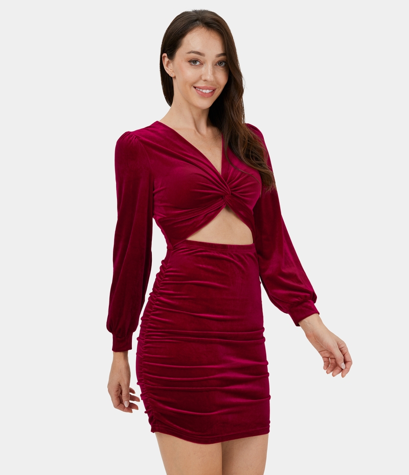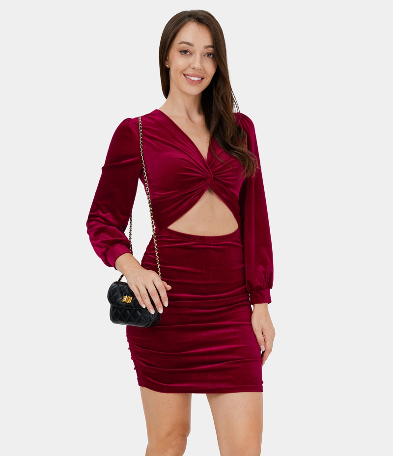 :: Halara V Neck Twisted Cut Out Velvet Bodycon Mini Casual Women's Dress Wine Red | 049365-DNH