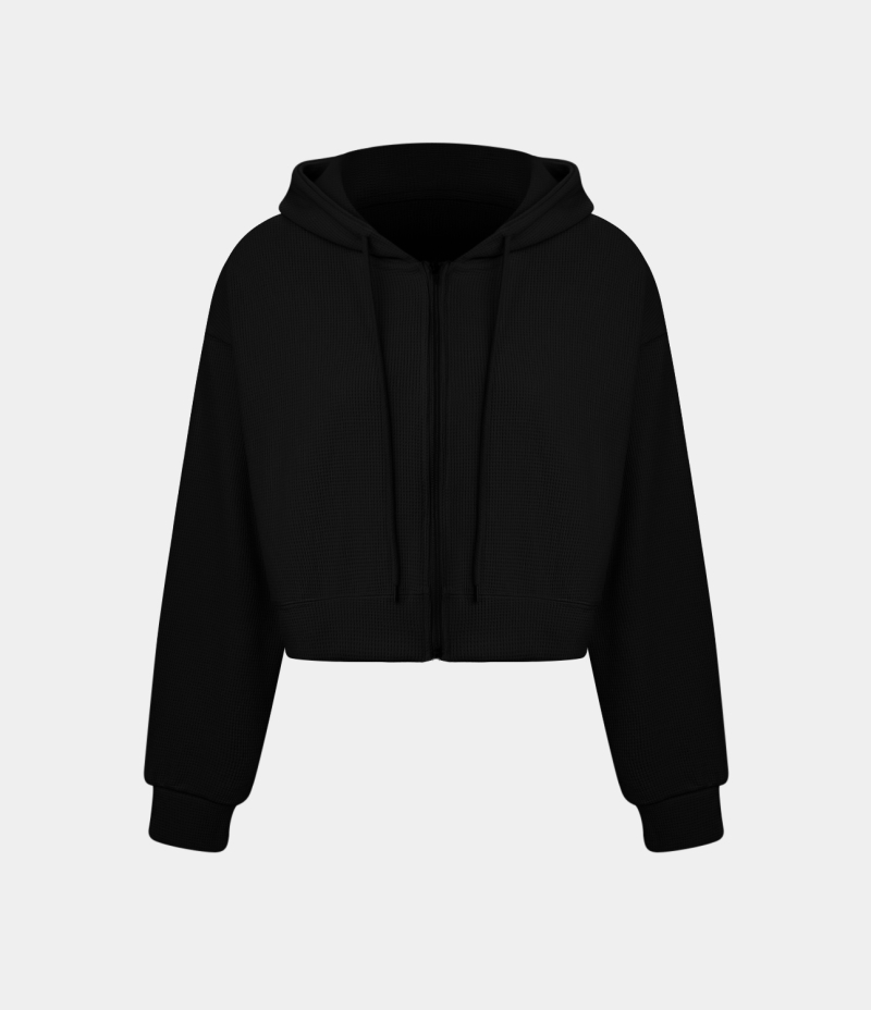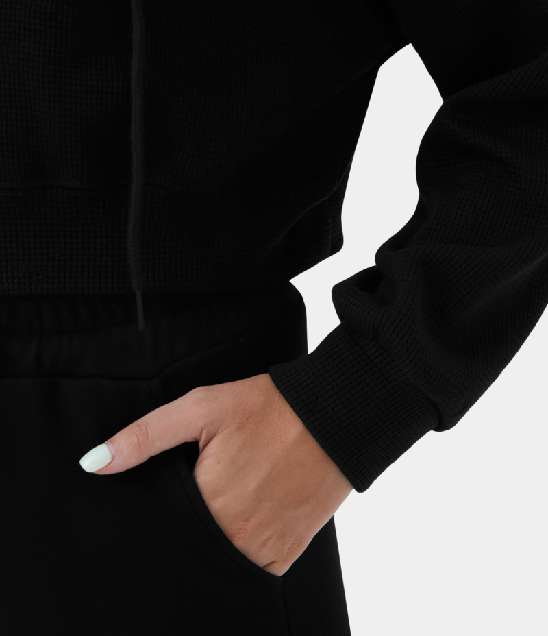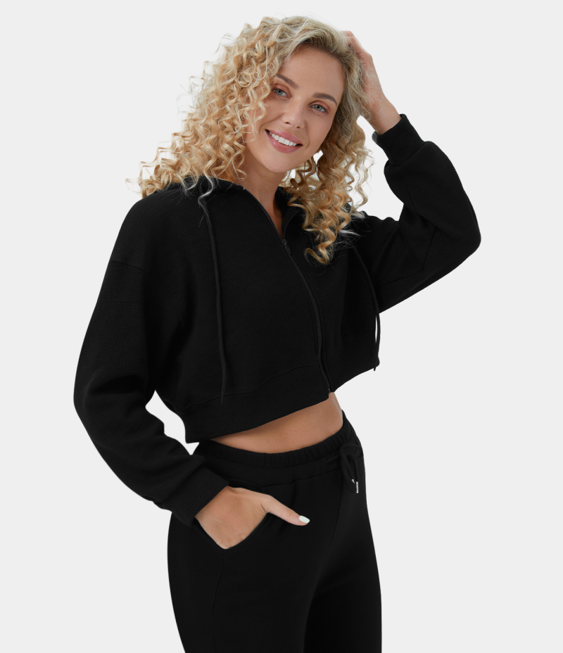 :: Halara Waffle Hooded Drawstring Zipper Cropped Casual Sports Sweatshirt Women's Tops Black | UAWXJEC-25